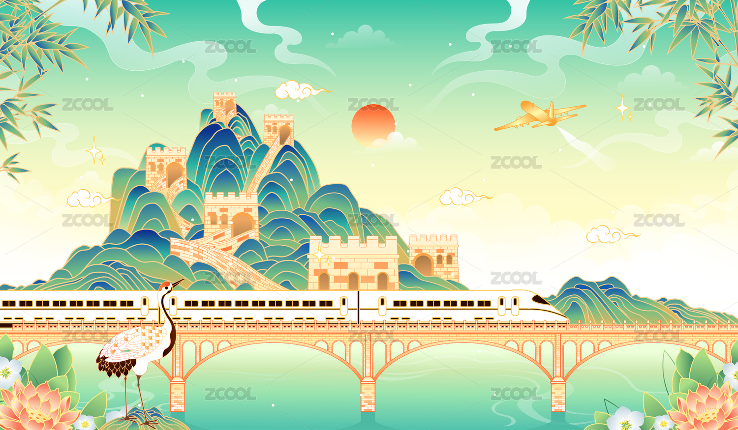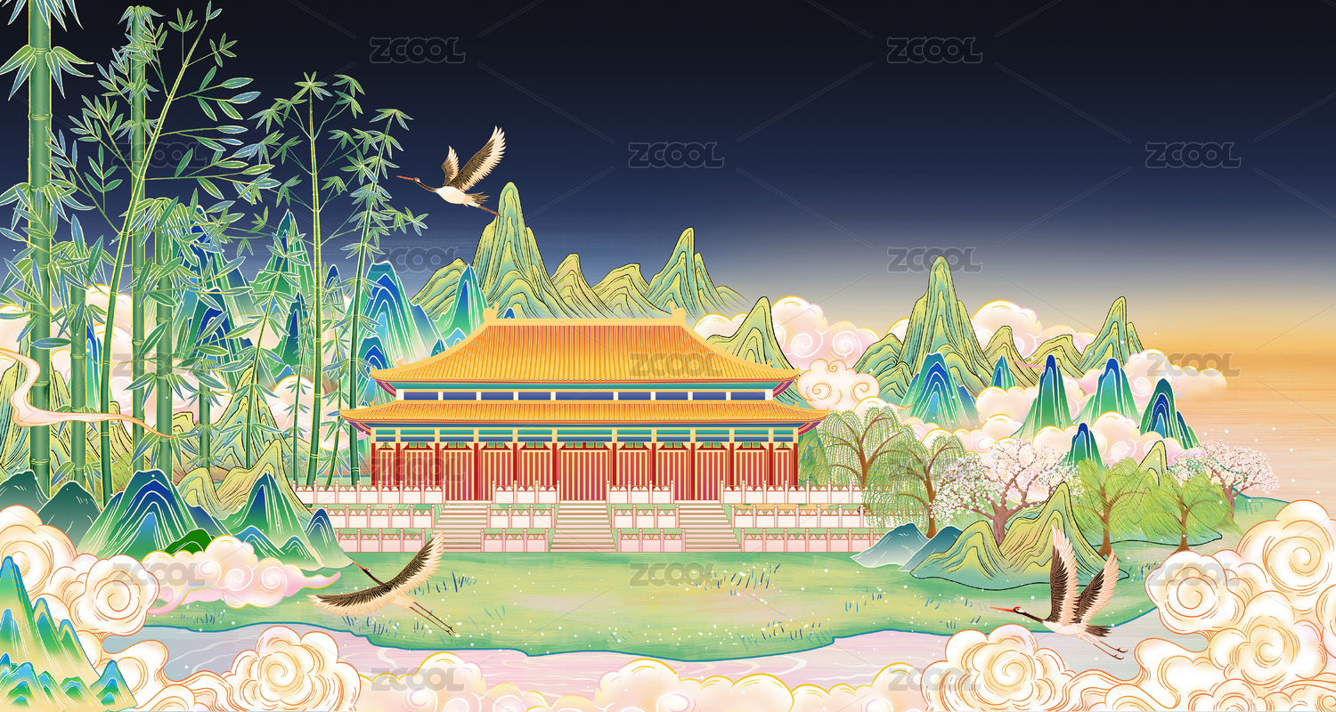 中国园林城市建筑国风山水插画海报背景