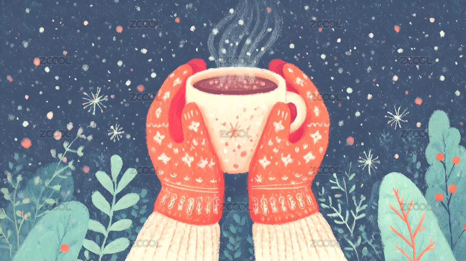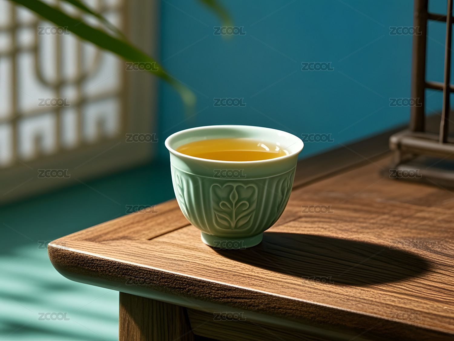 花纹釉彩陶瓷杯中的咖啡以及下午茶摆盘