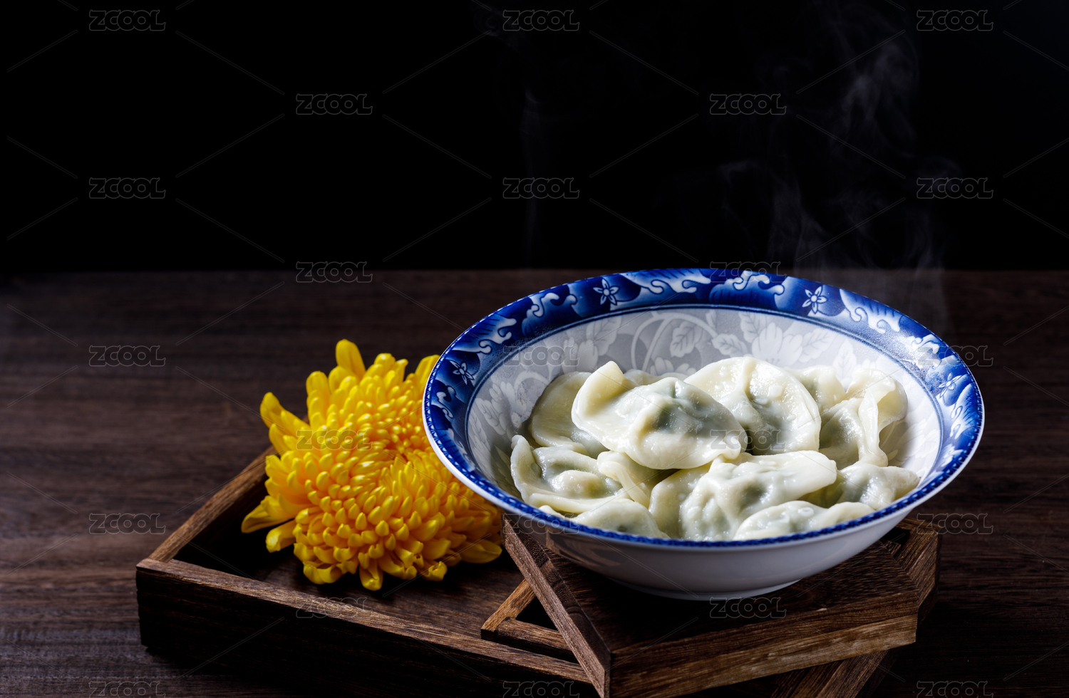 棕色木桌上一碗热气腾腾的中国传统食物饺子
