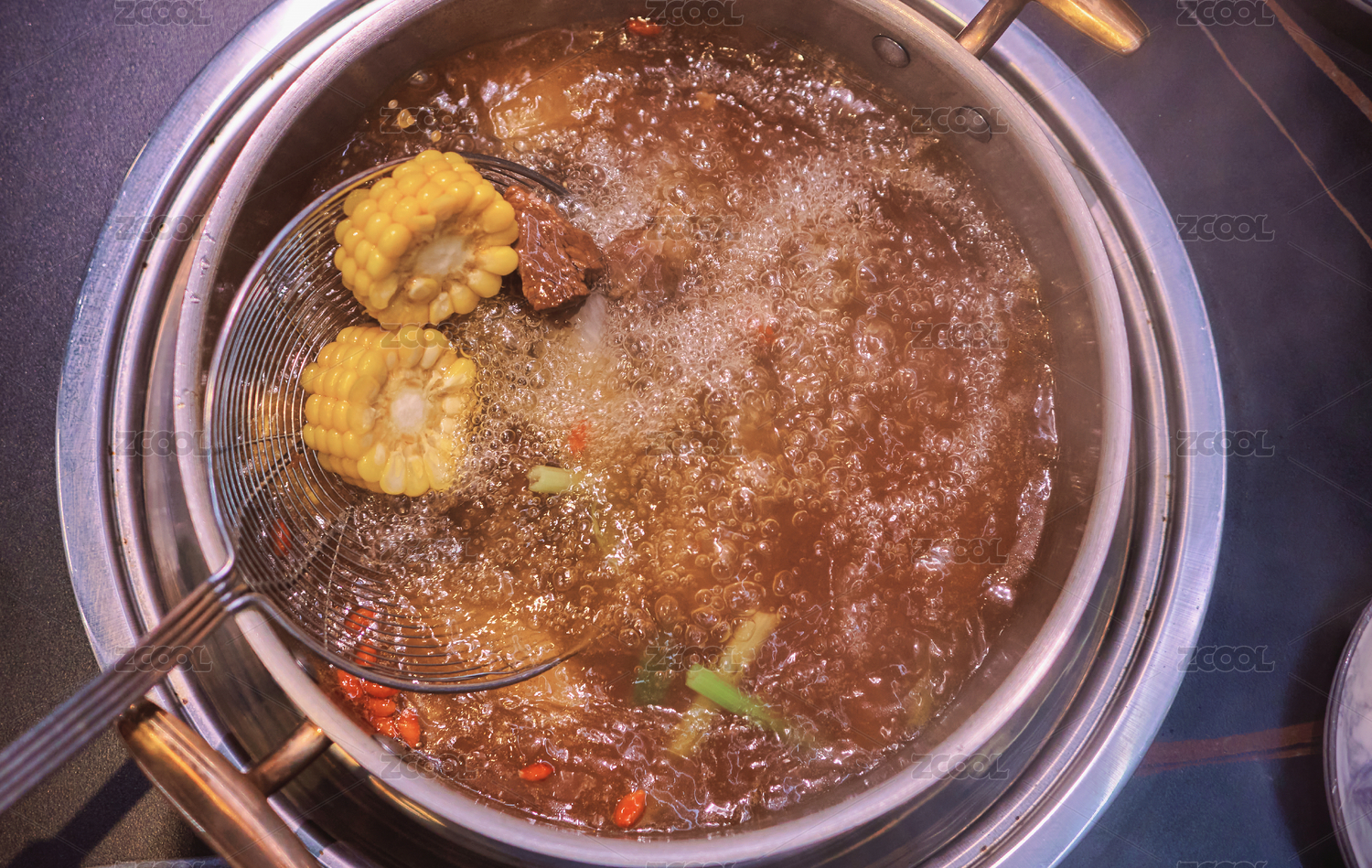 热气腾腾的火锅锅中煮着玉米和蔬菜