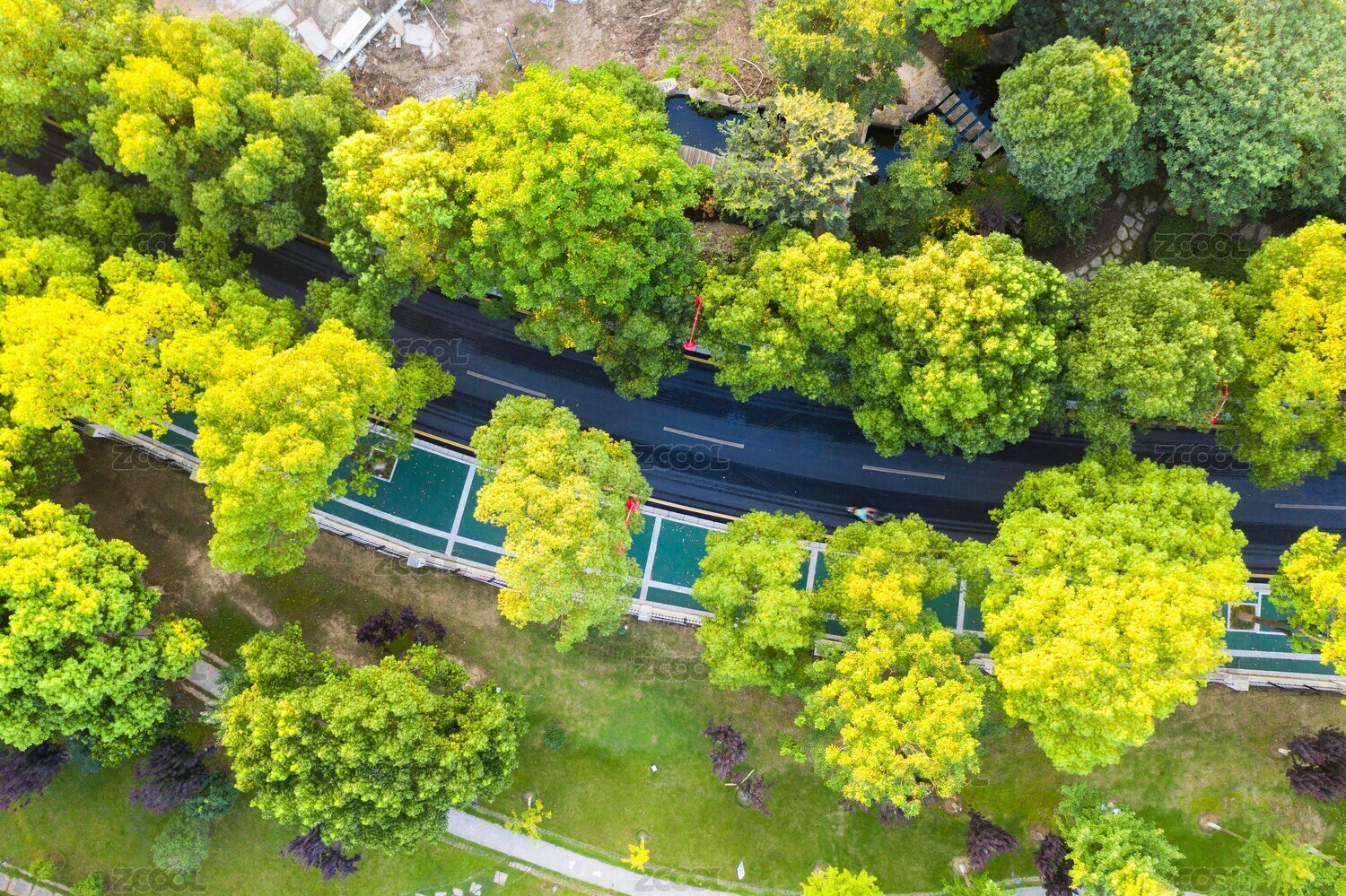 航拍城市中的林间小道