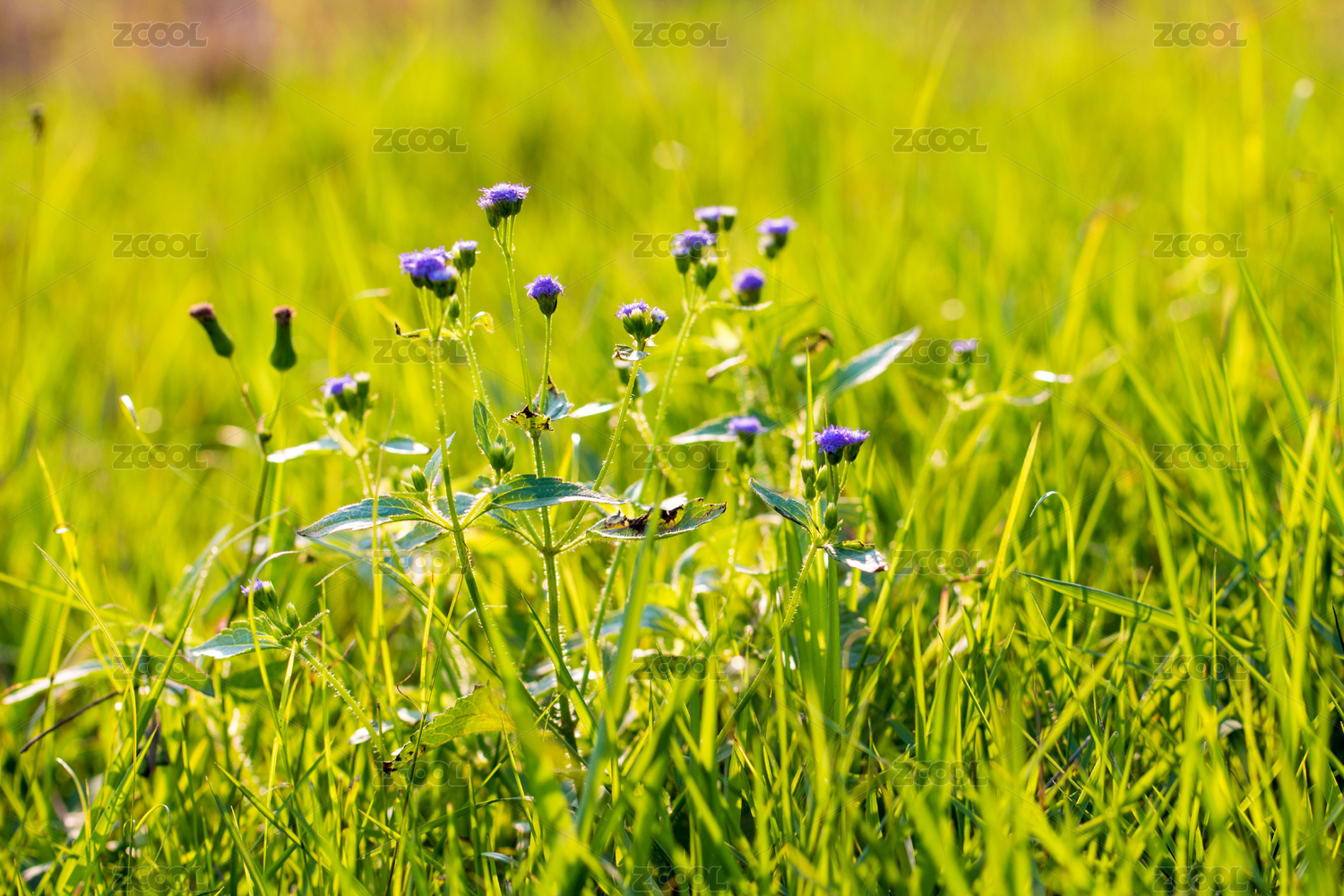 晨光中沾满露珠的青草野花