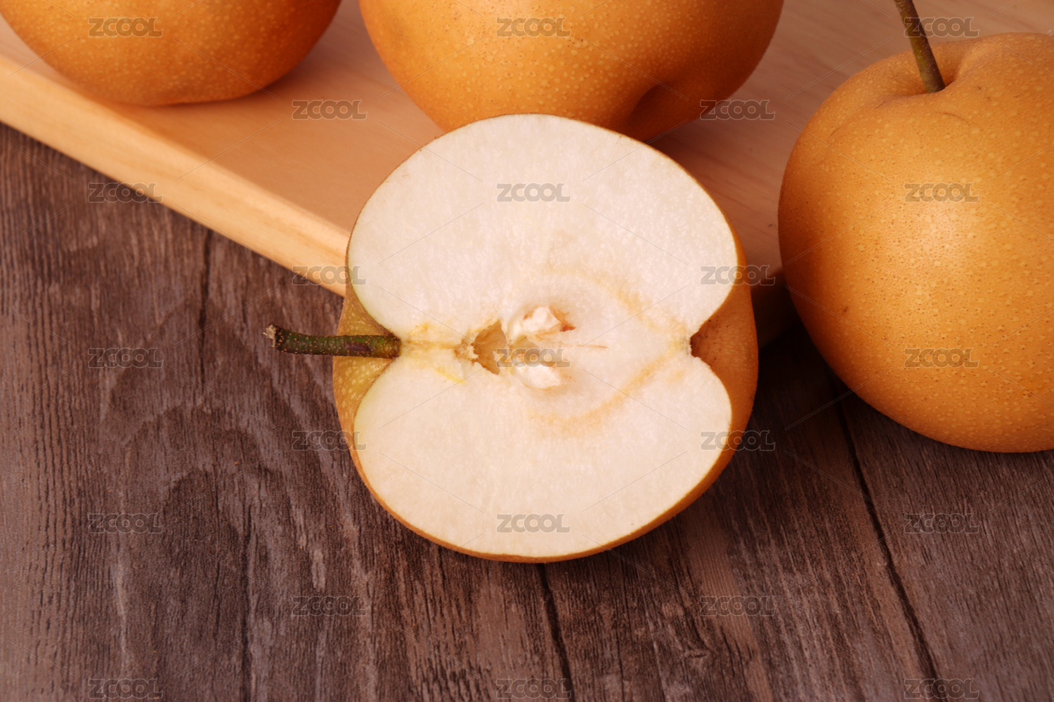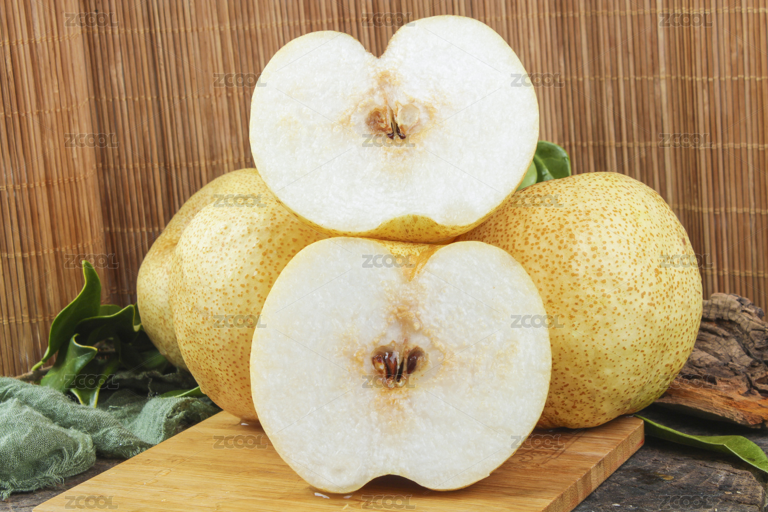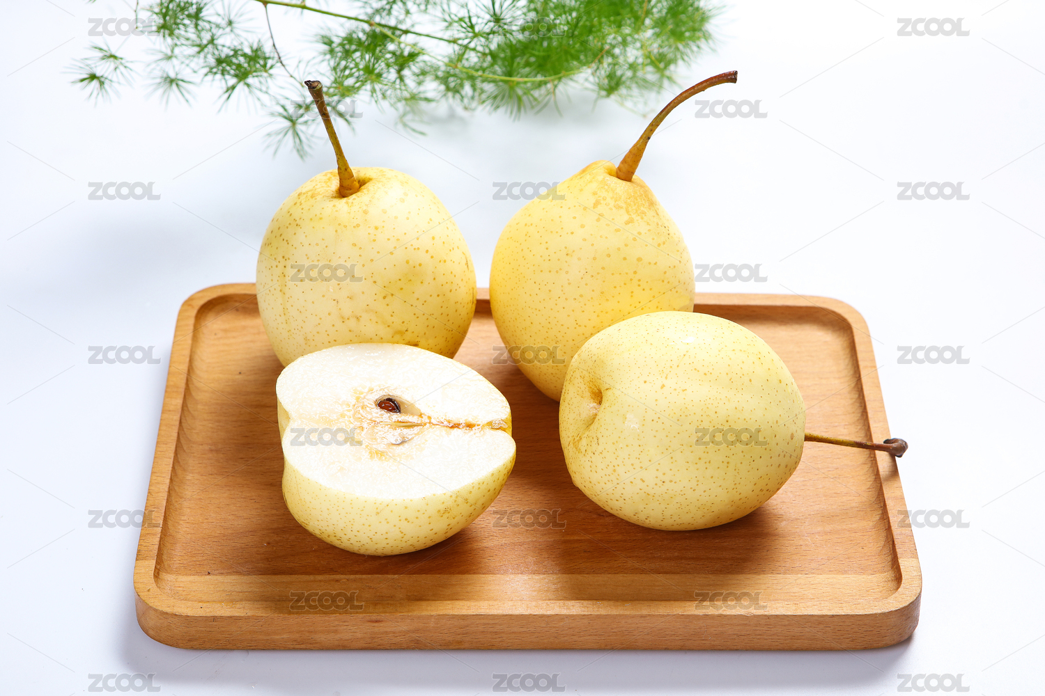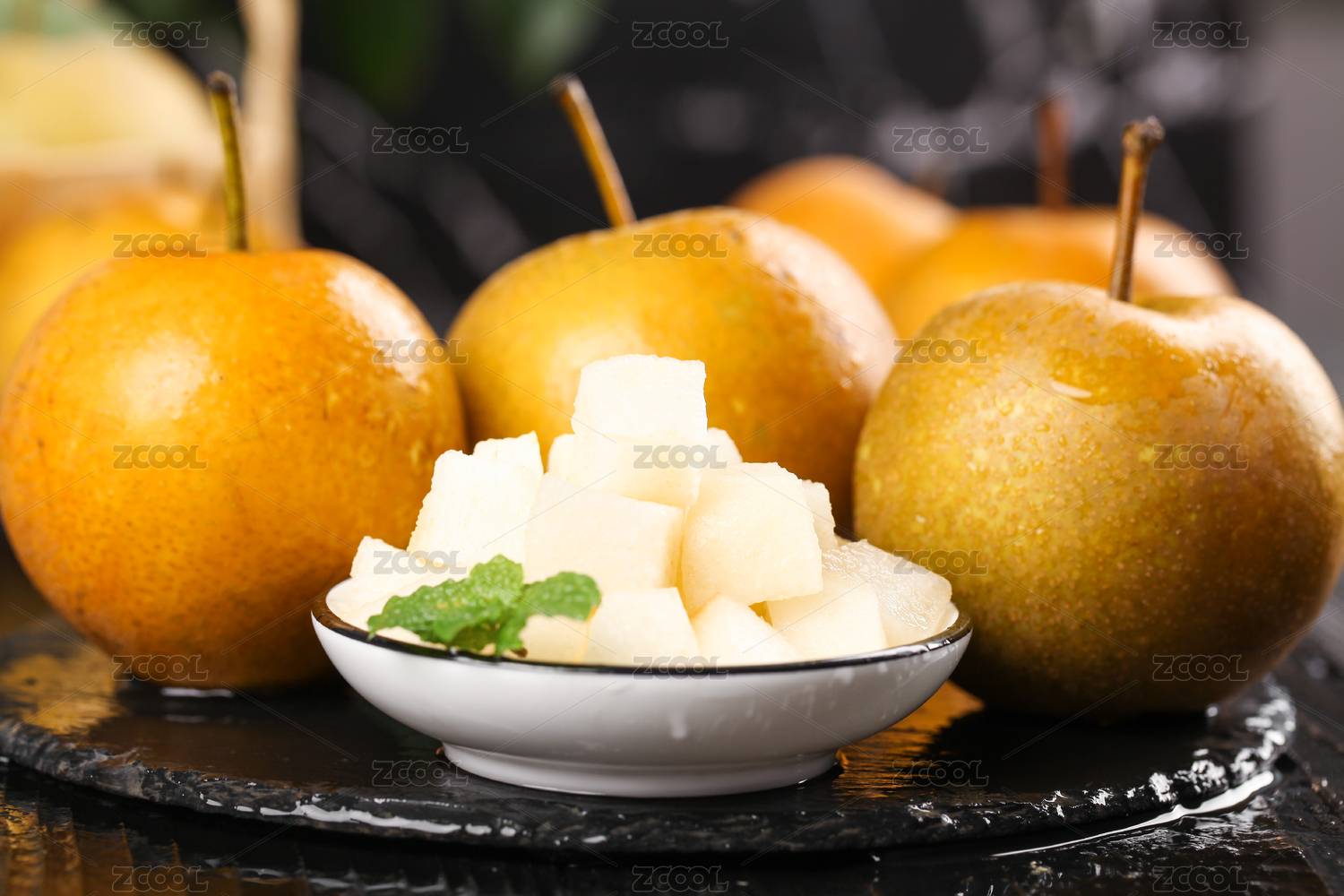 黑底上放着莱阳秋月梨和一碟梨子果肉