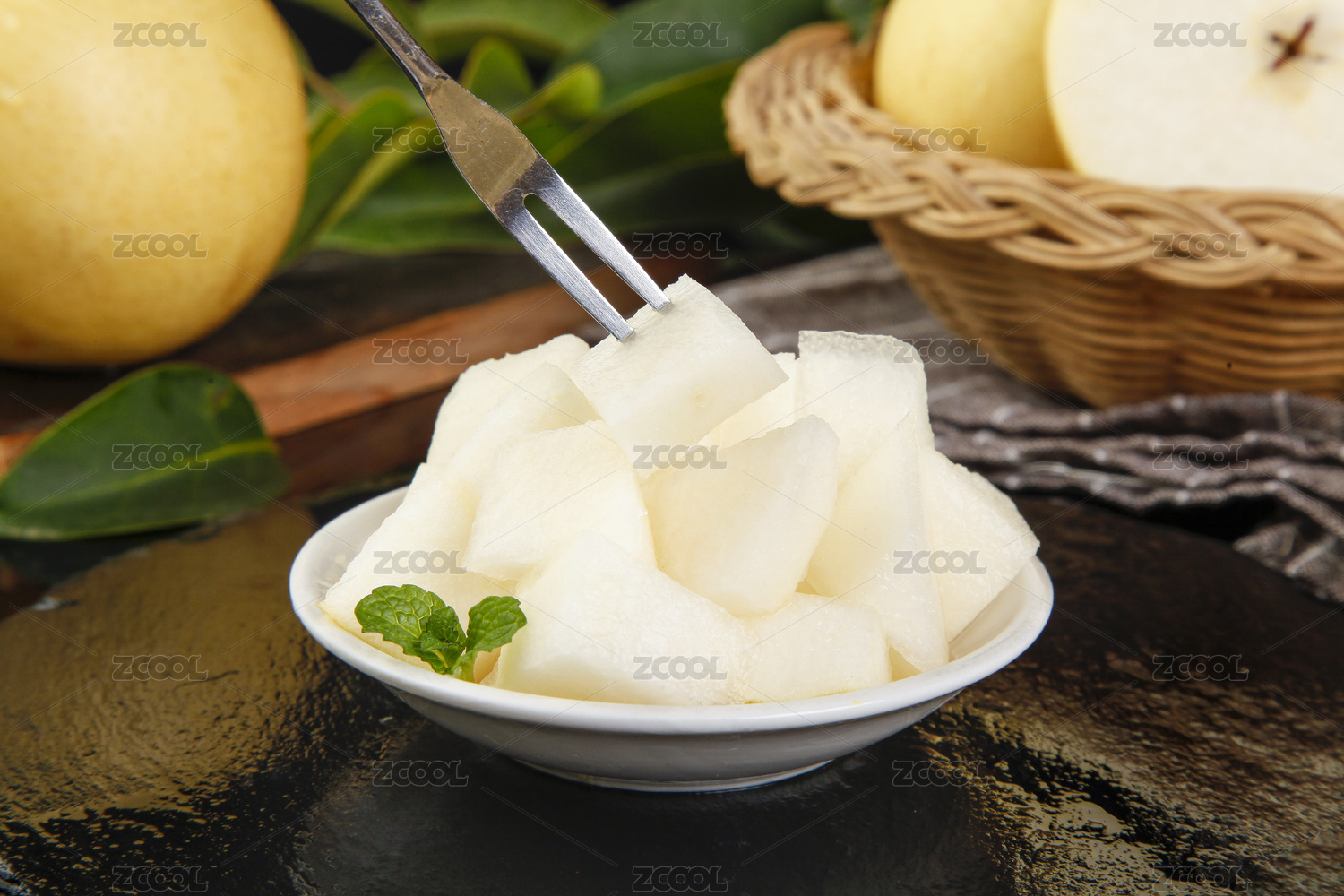 黑底上放着一盘切块雪花梨和叉子上叉着梨子