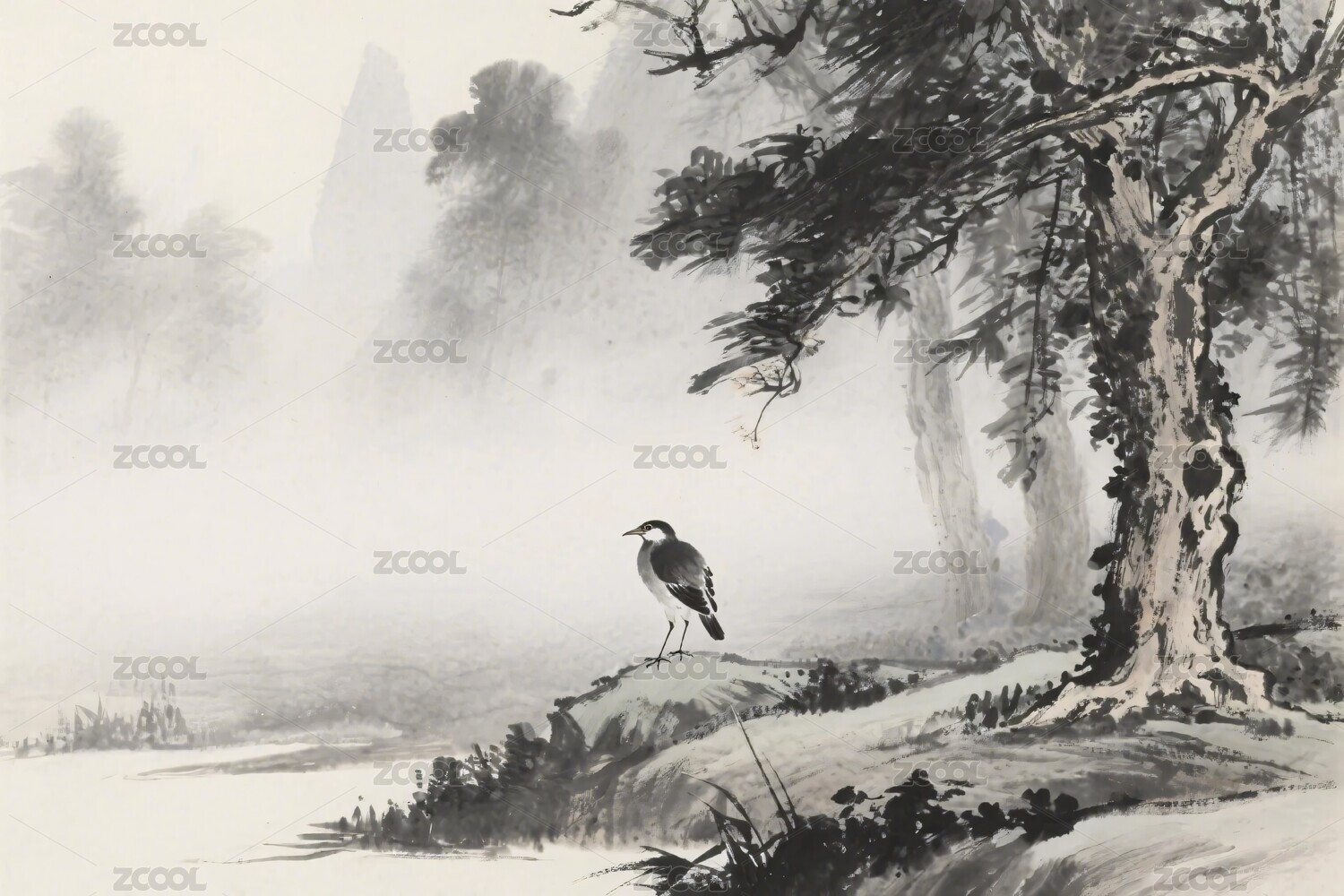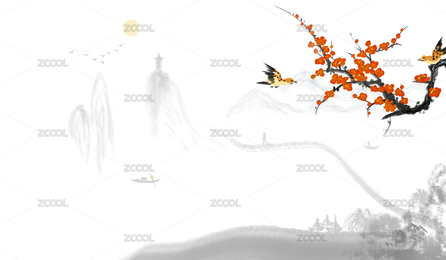 水墨山水花鸟风景插画