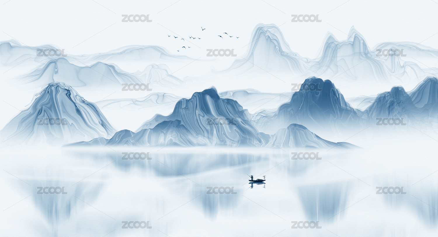 蓝色意境山水画新中式山水插画背景
