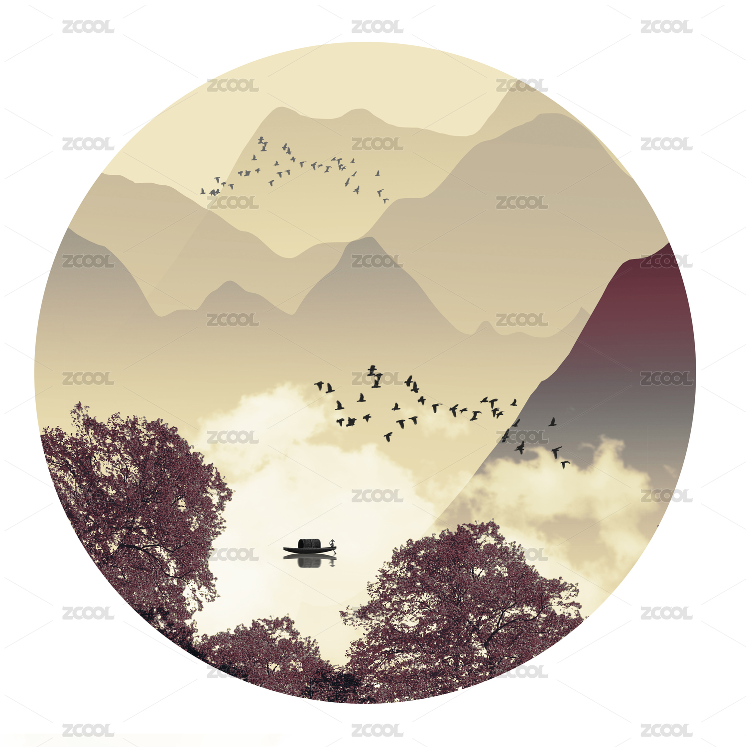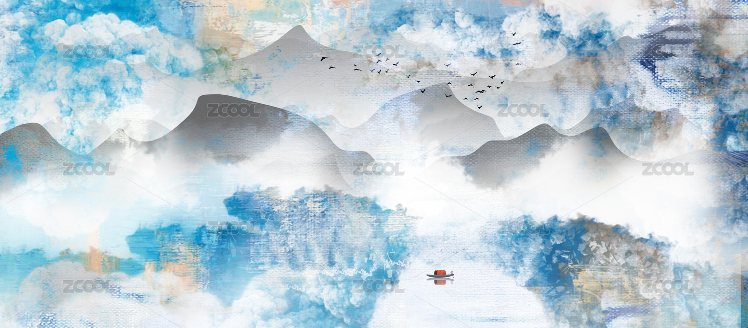 手绘新中式意境水墨山水画