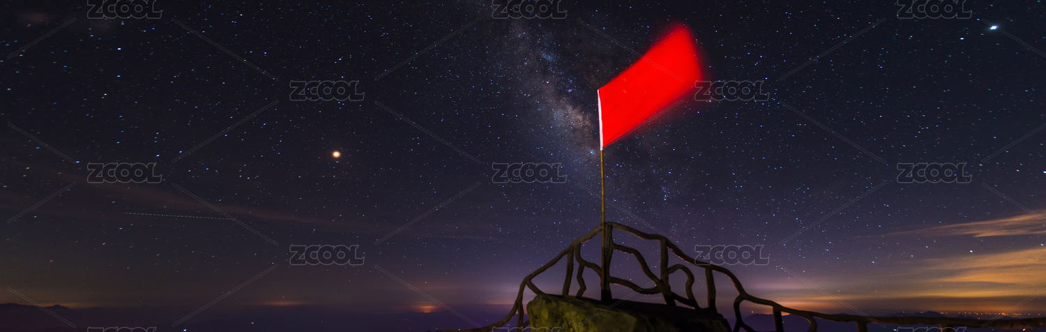 鲜艳的红旗飘扬在薄刀峰漫天繁星下的山巅