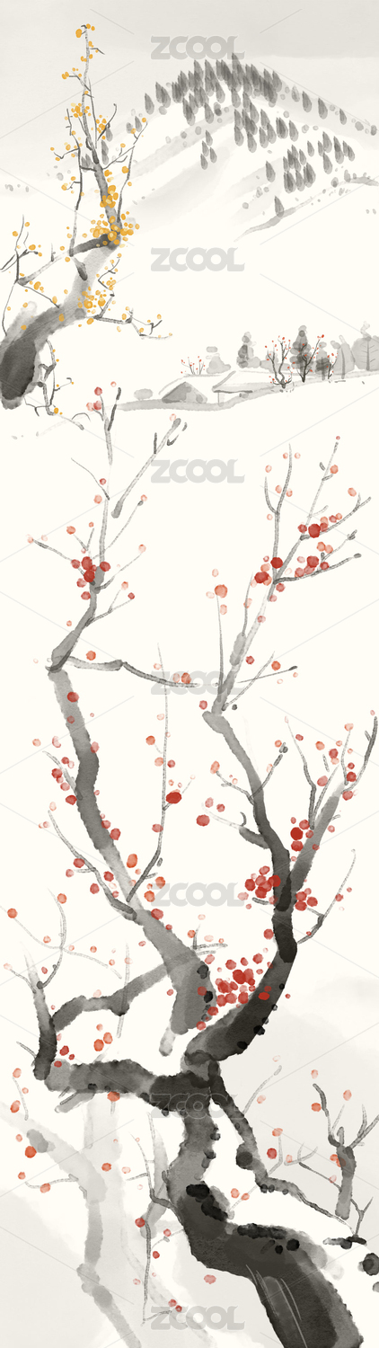冬天的雪村与梅花