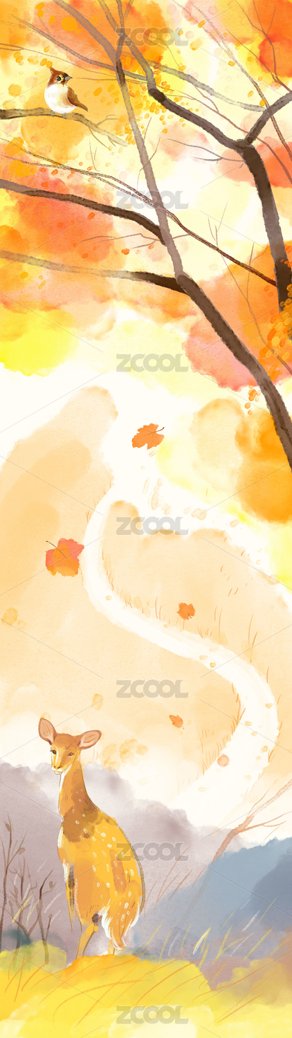 秋天的落叶小鸟与小鹿