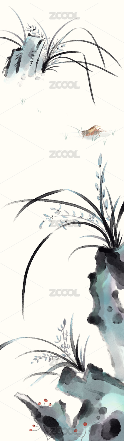 兰草太湖石与小虫国画风格