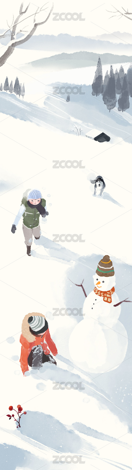 堆雪人的小孩与狗