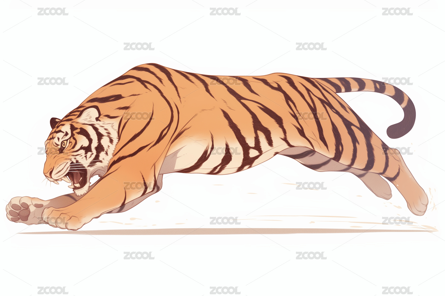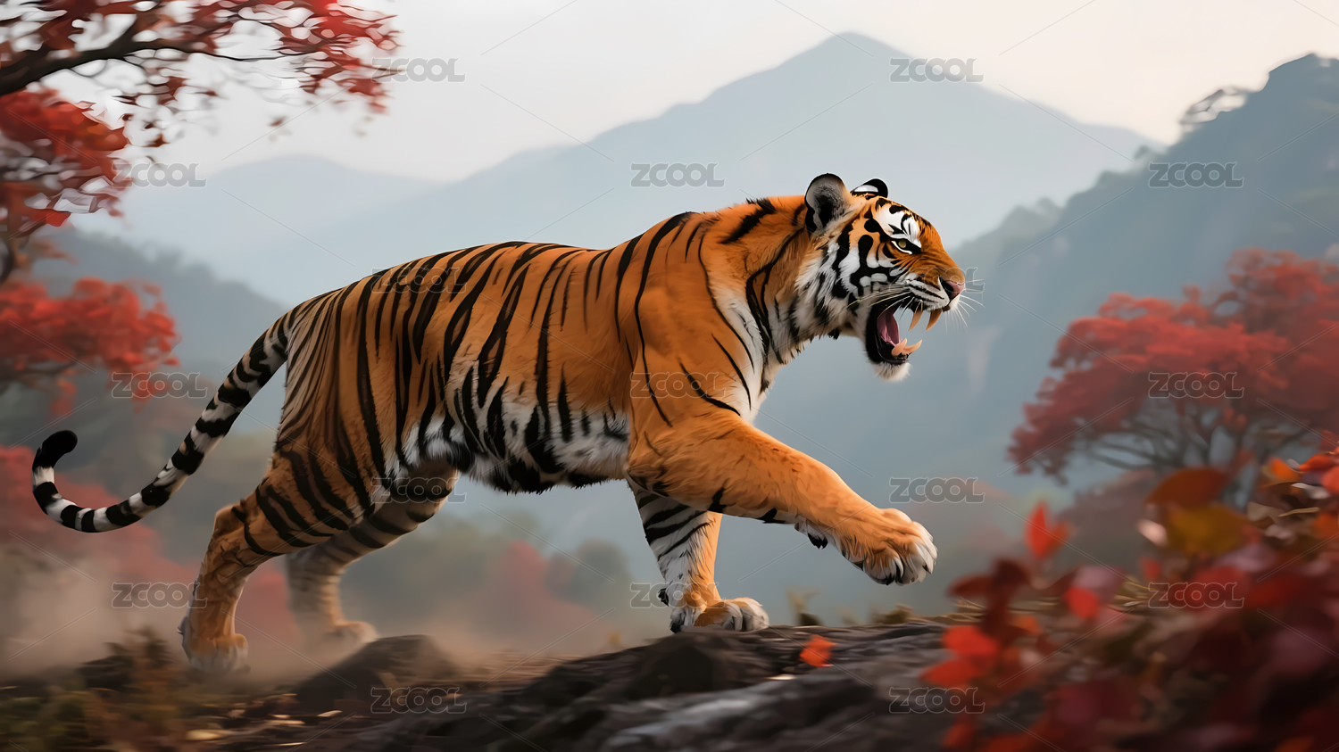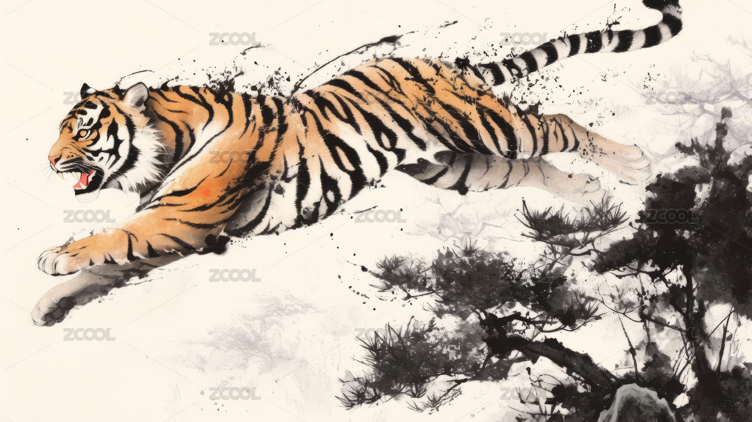 跳跃奔跑的老虎动物户外自然国画工笔画