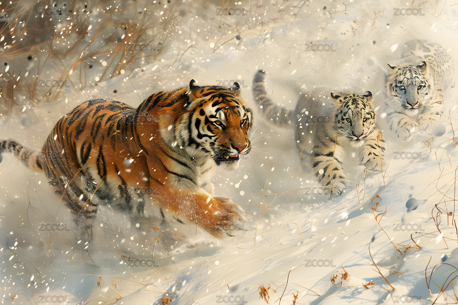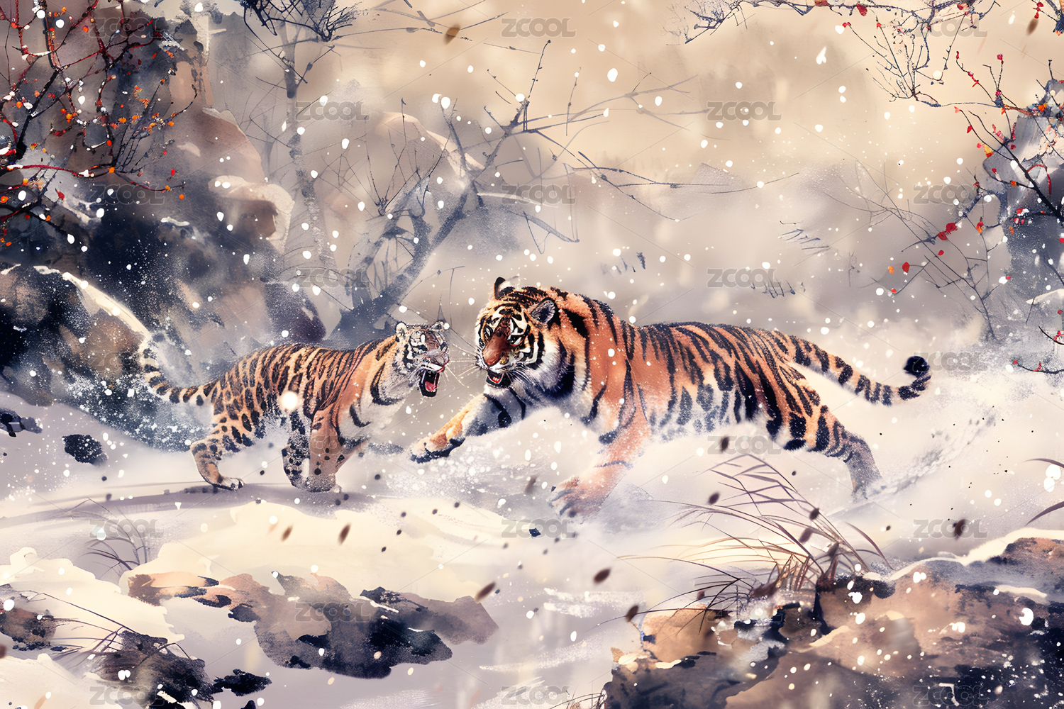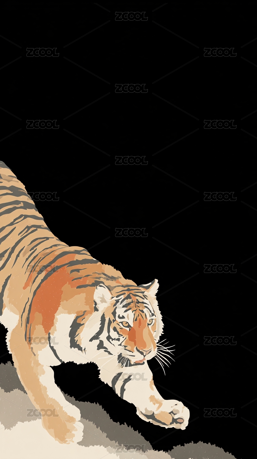 跳跃奔跑的老虎动物户外自然国画工笔画