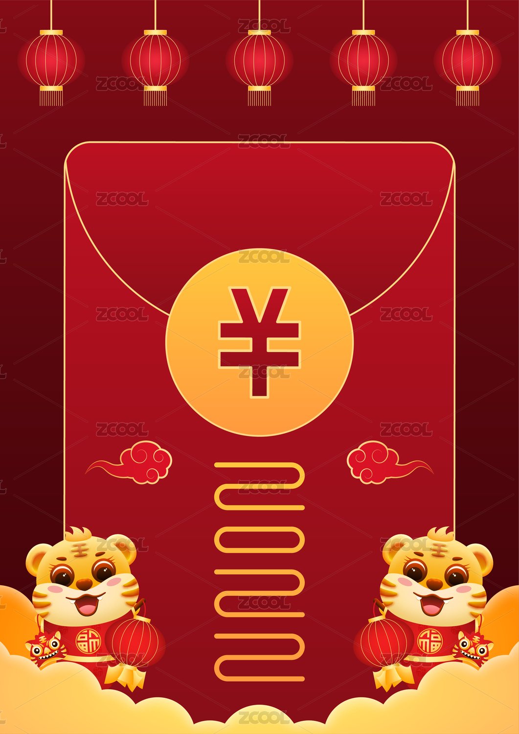 两只老虎提着灯笼和布老虎在福字前奔跑
