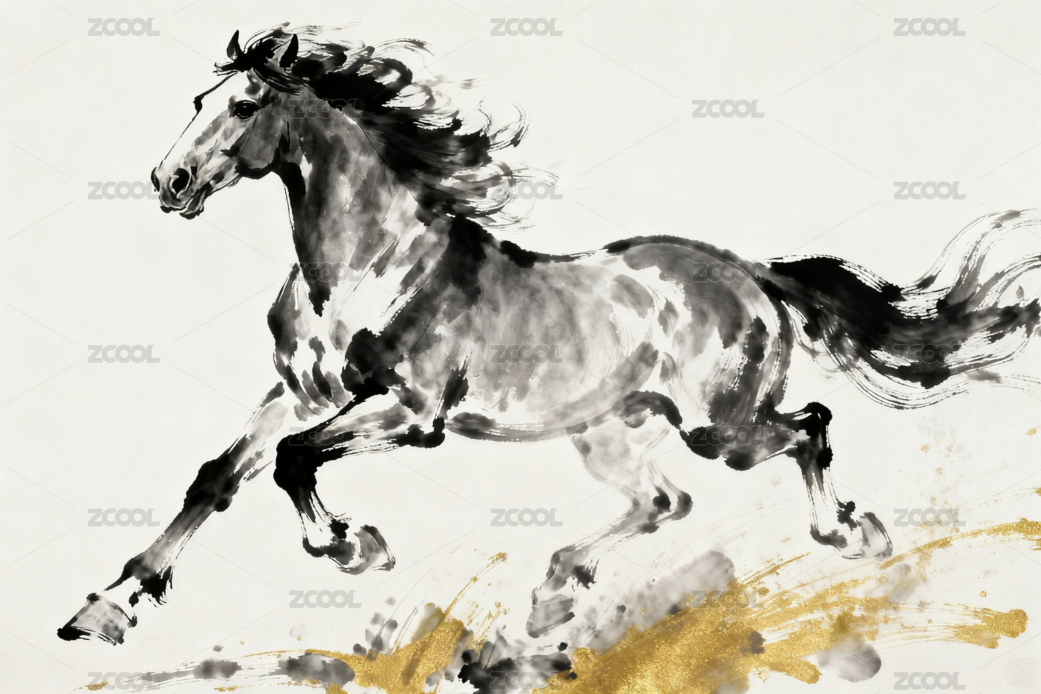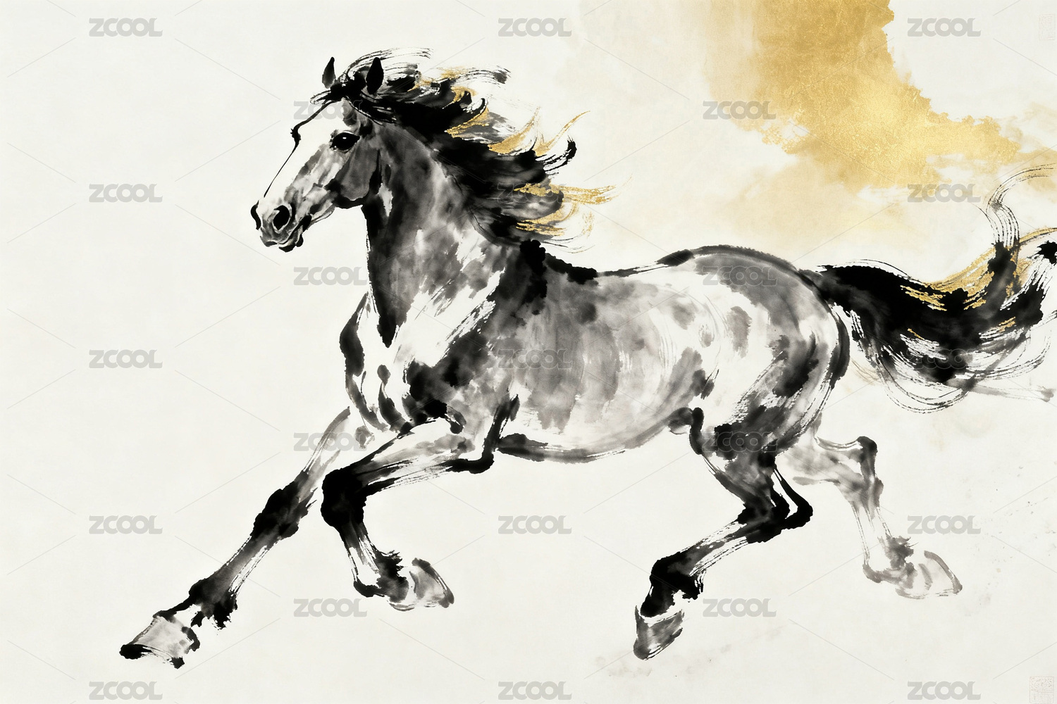 水墨奔马图金纹祥云衬跃马