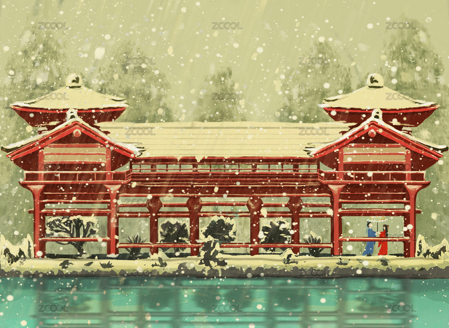 古风飞雪美景离别情人场景