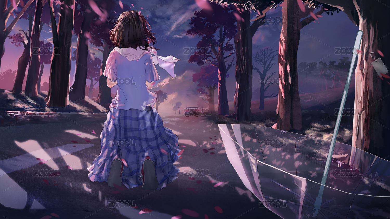春季樱花树下少女的背影,离别插画