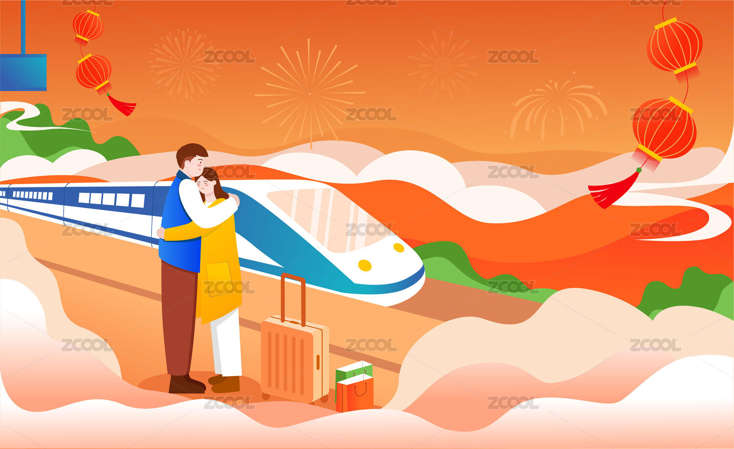 情侣高铁车站拥抱离别春节回家过年插画海报