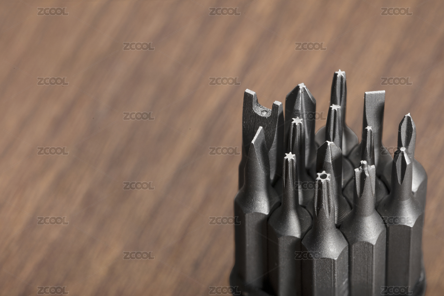木纹桌面上的螺丝刀和螺丝头批头钻头