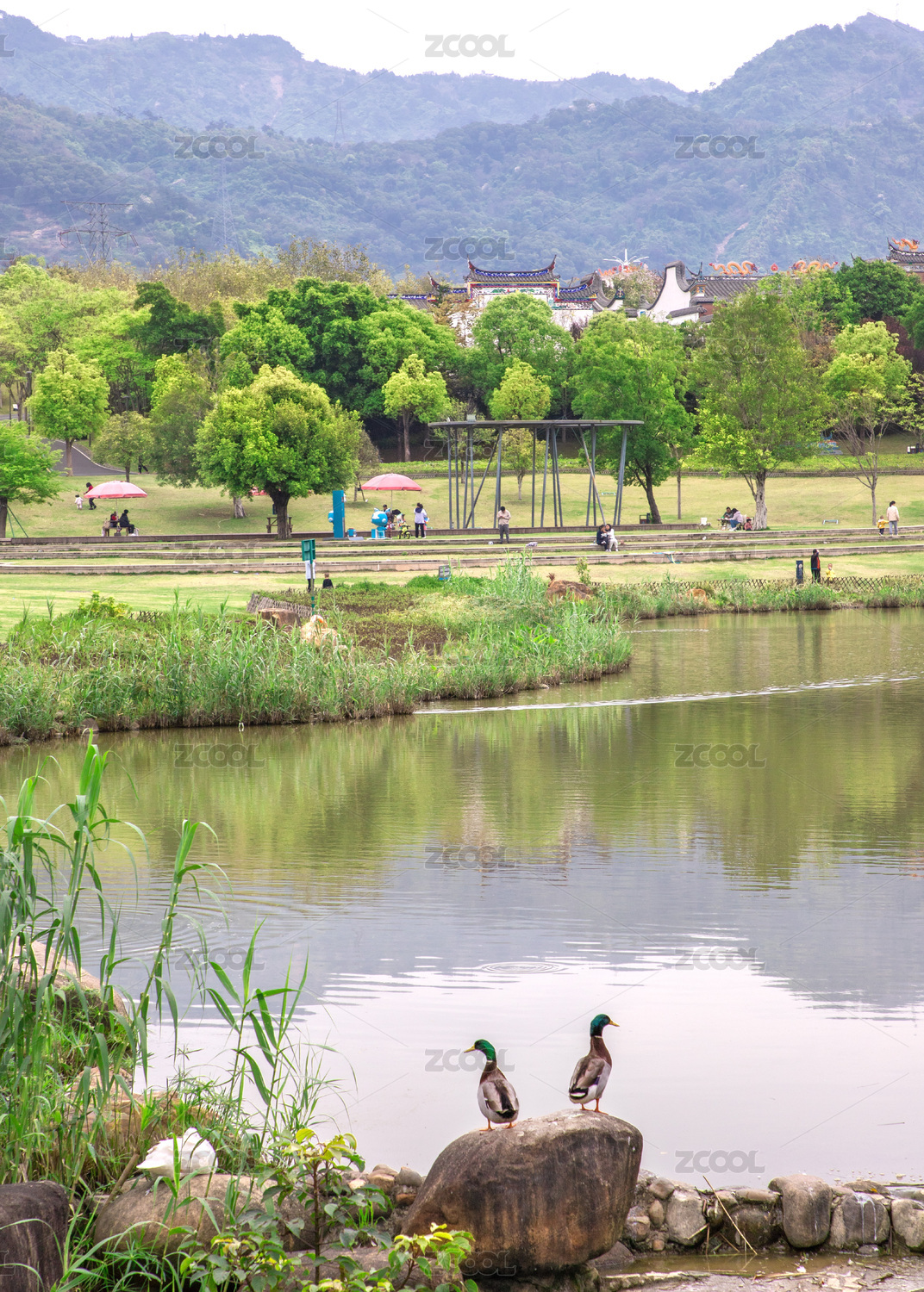 福州晋安湖公园湖畔小鸭、树林、草地及倒影