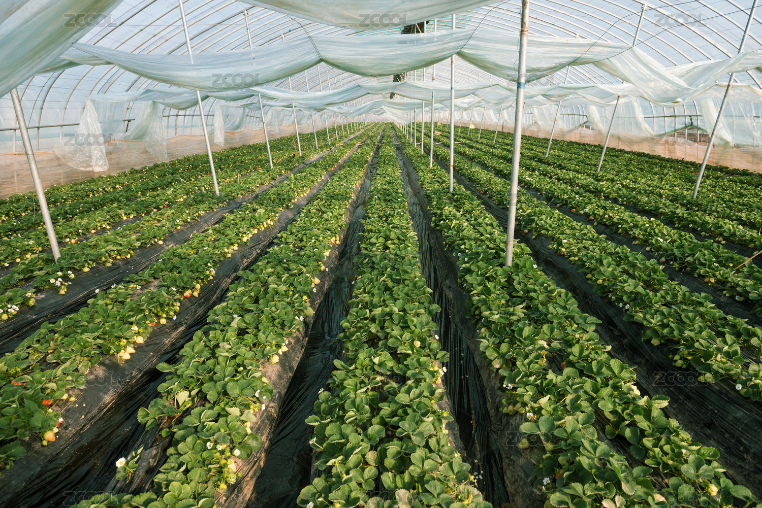 阳光下的草莓大棚里整齐的地垄