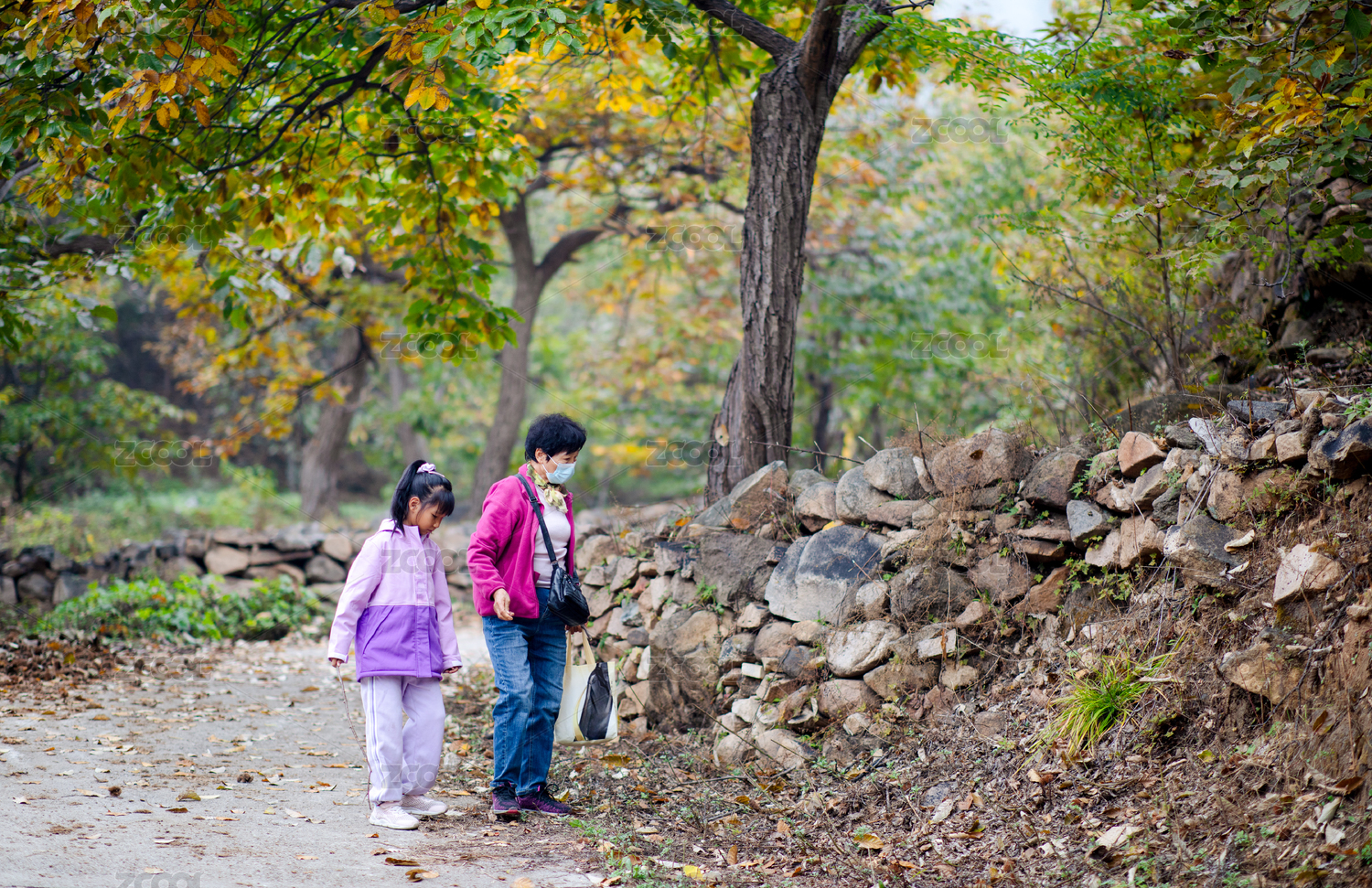 奶奶带着孙女户外寻找板栗