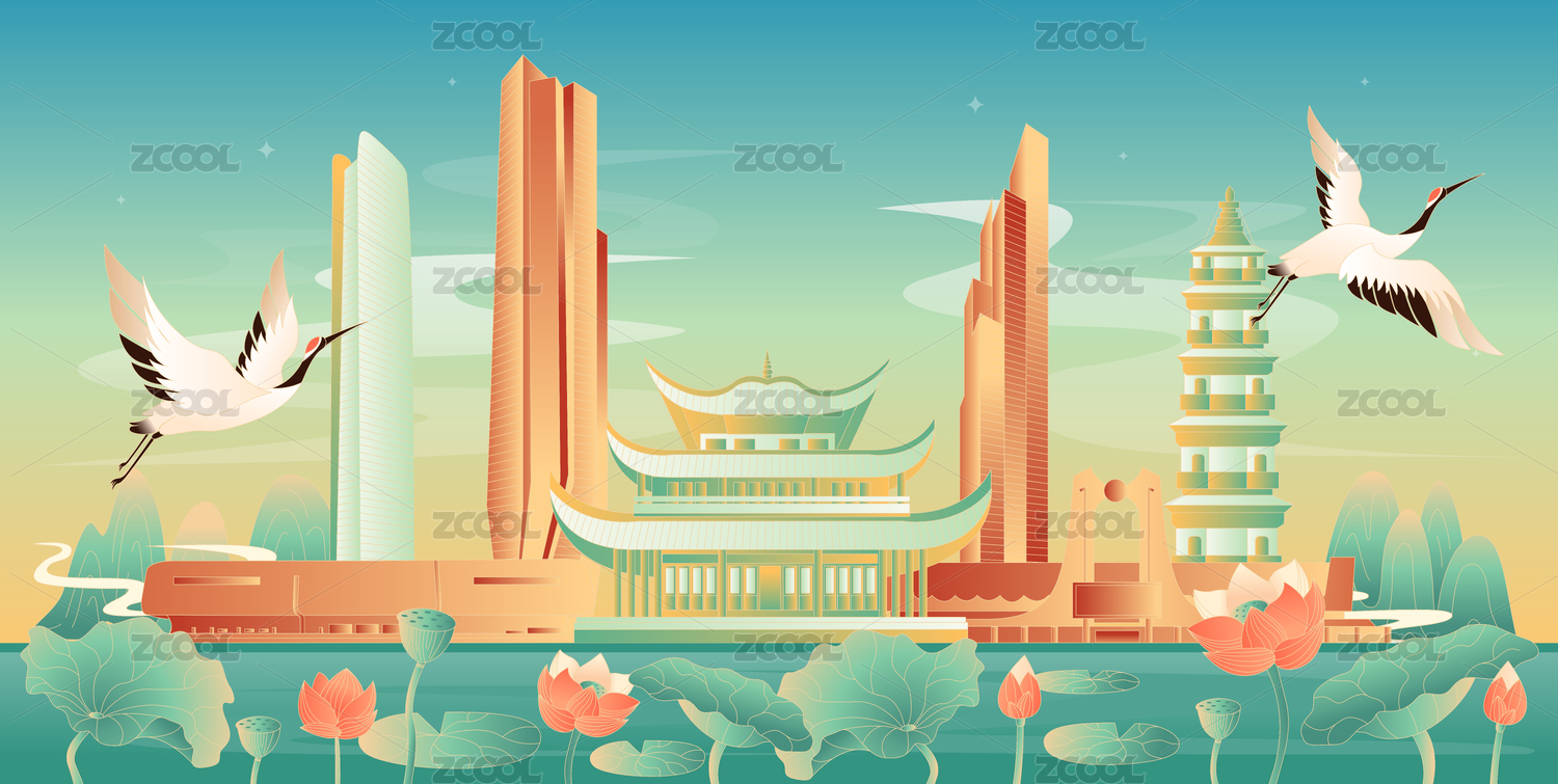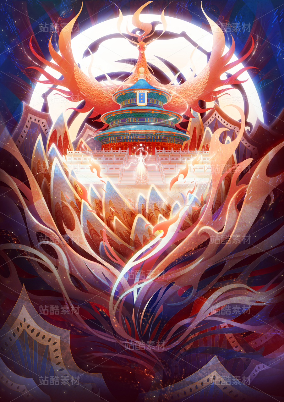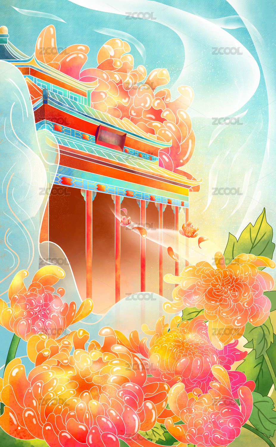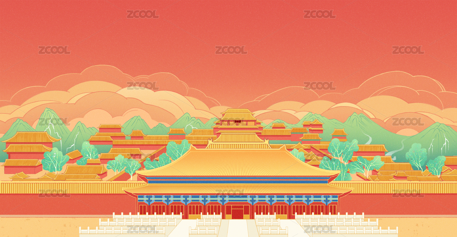 红色渐变大气国潮风插画故宫远山仙鹤祥云