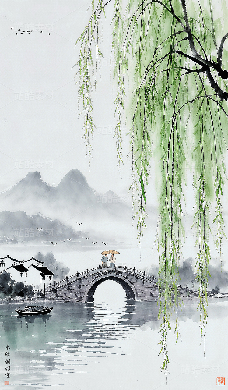 春季国风水墨意境山水画