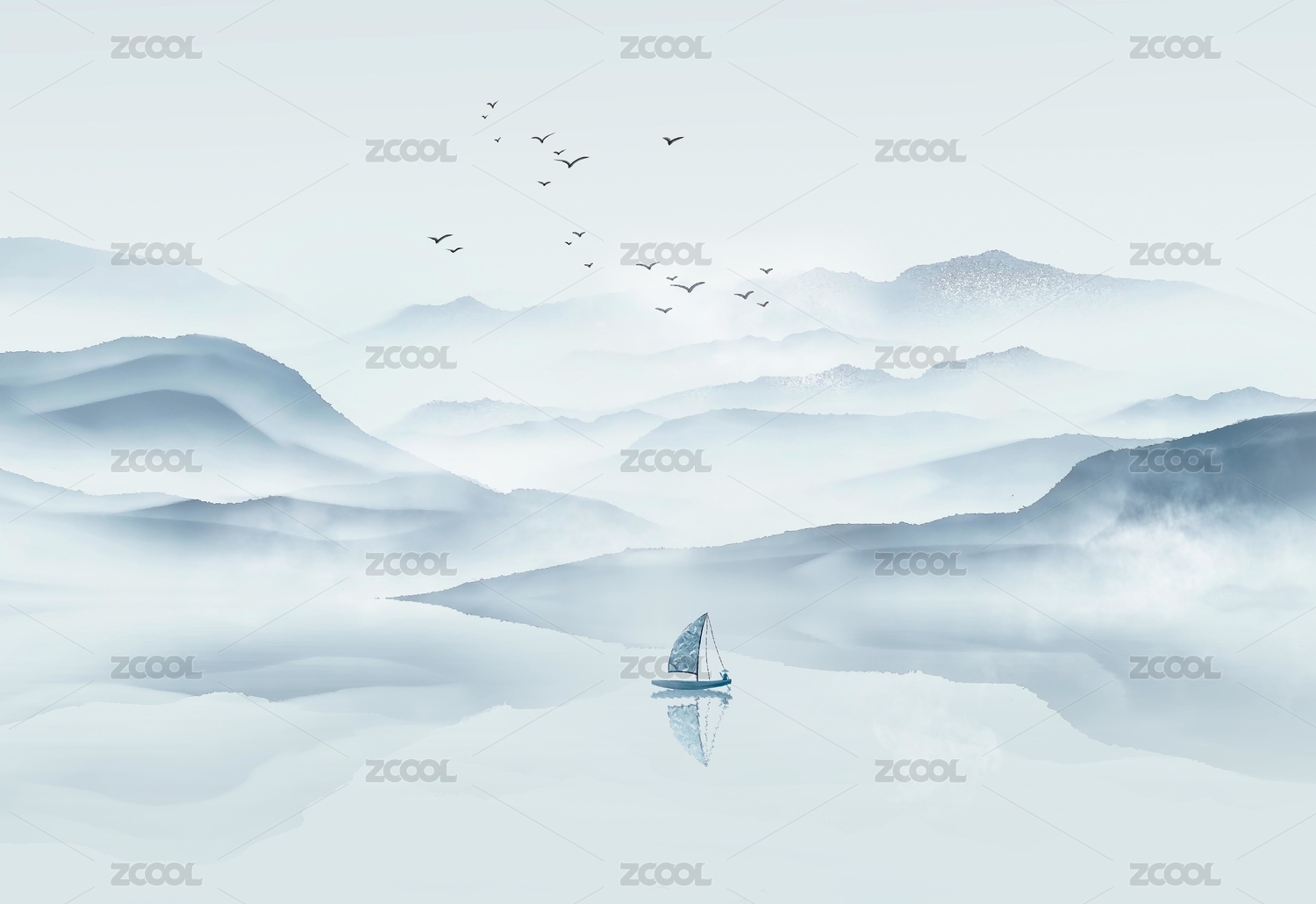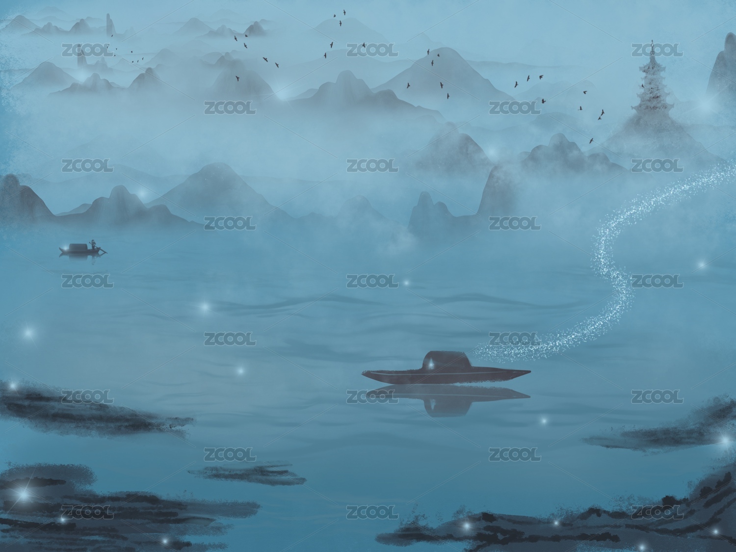 蓝色意境山水画素材背景