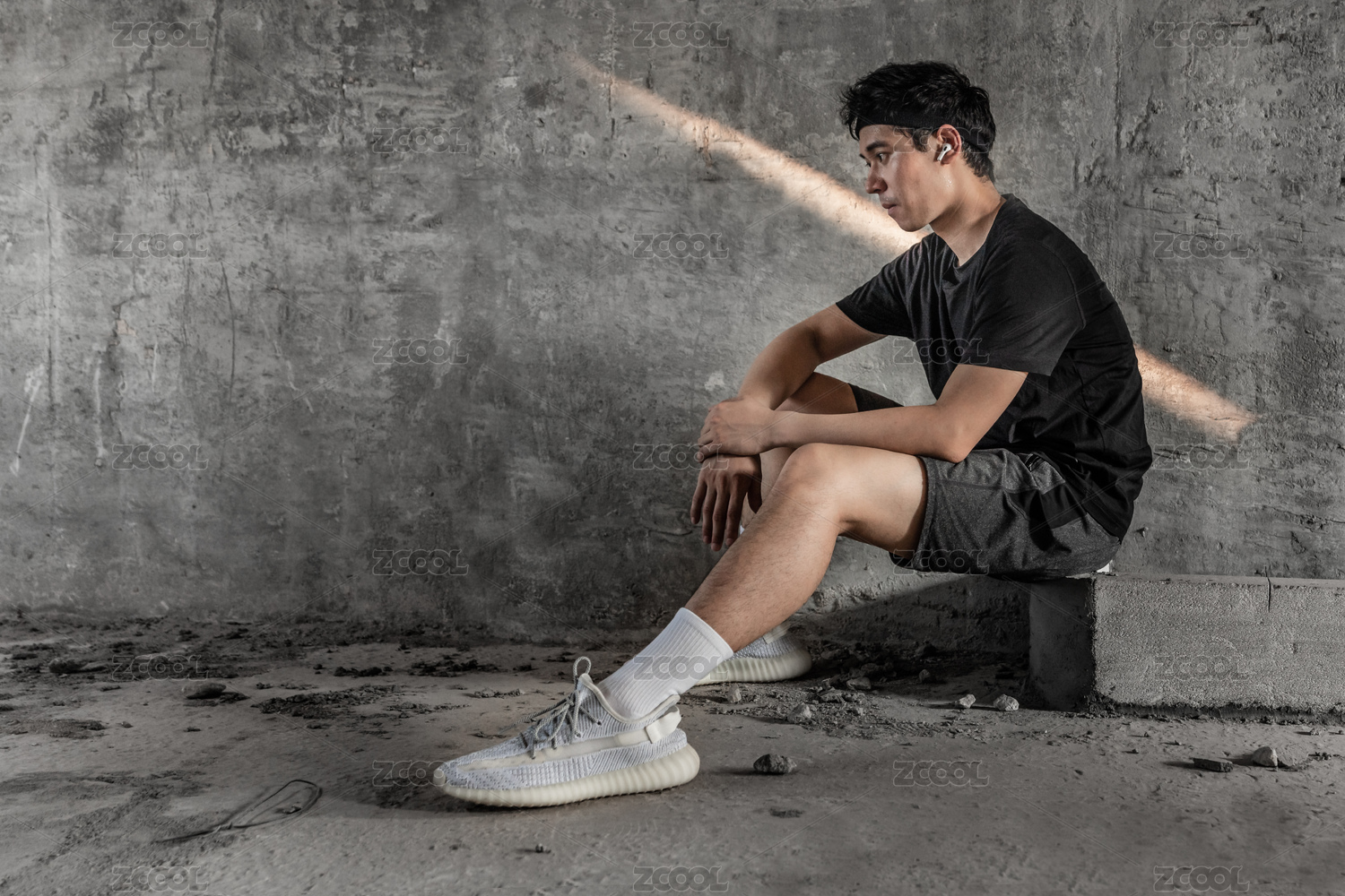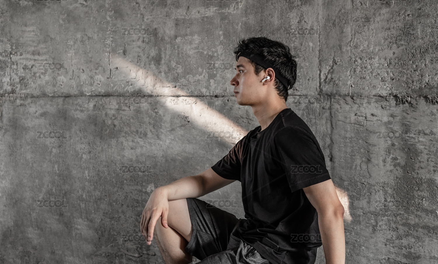 坐在墙边戴着耳机休息发呆的运动男士