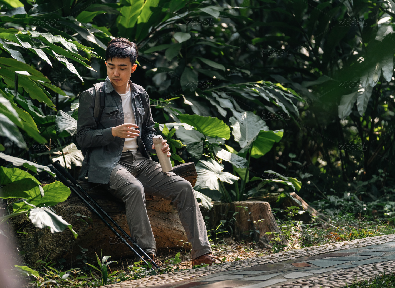 亚洲徒步男子坐在户外树桩上休息
