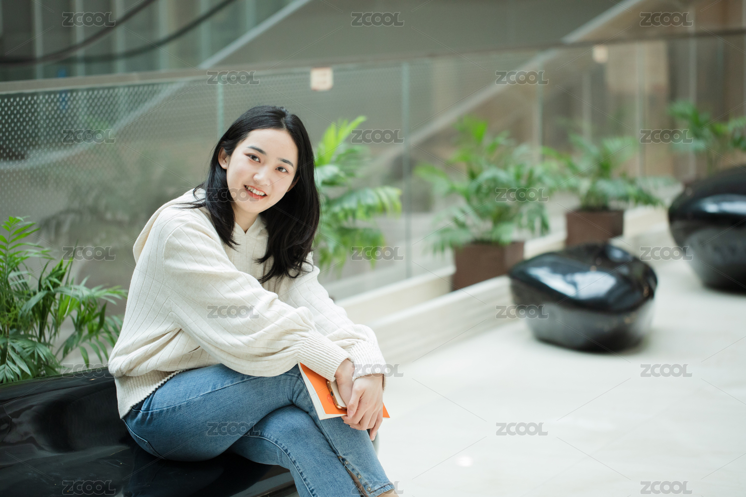 青年女学生坐在图书馆休息放松