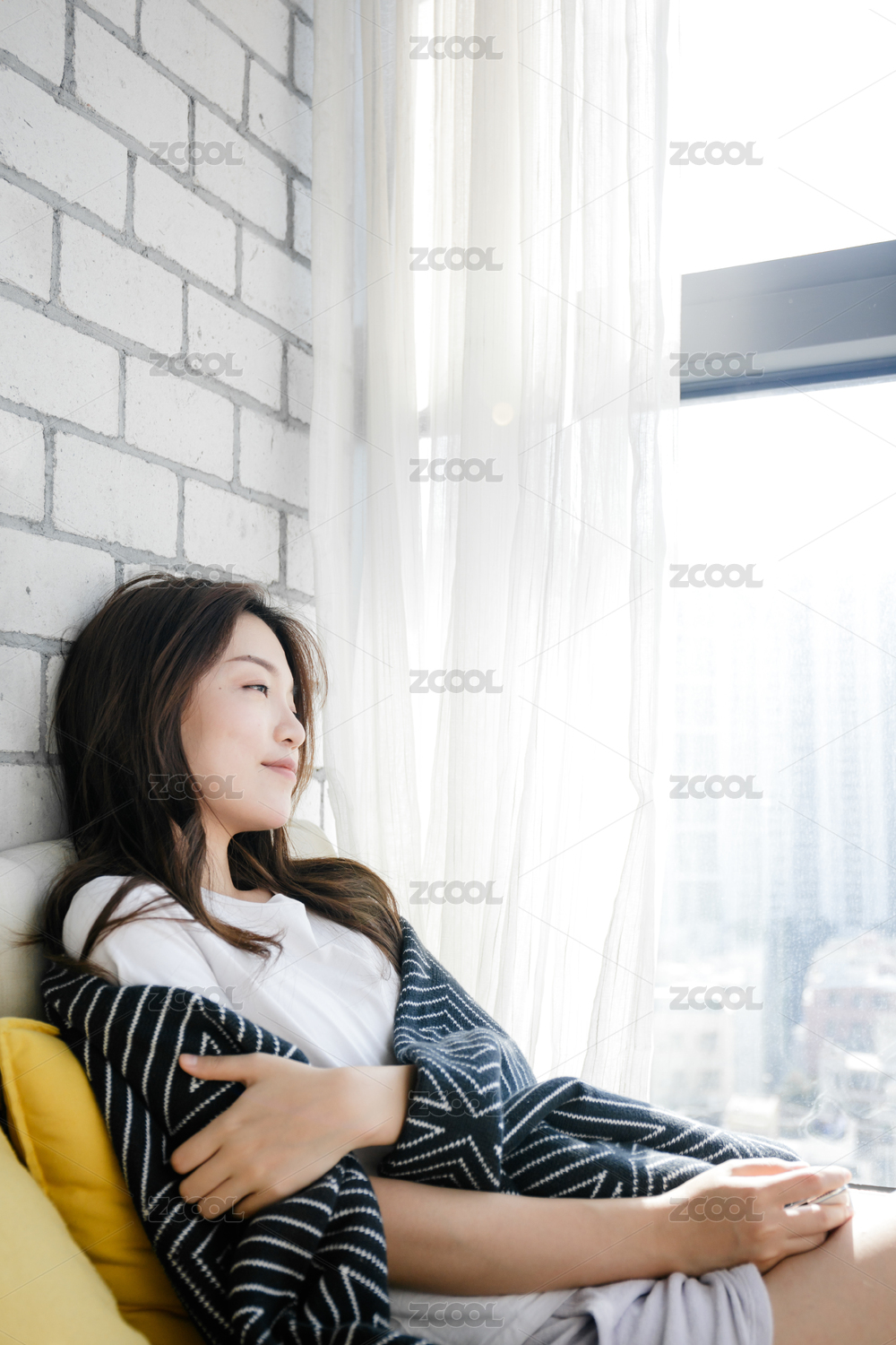 靠在窗边休息的年轻女孩