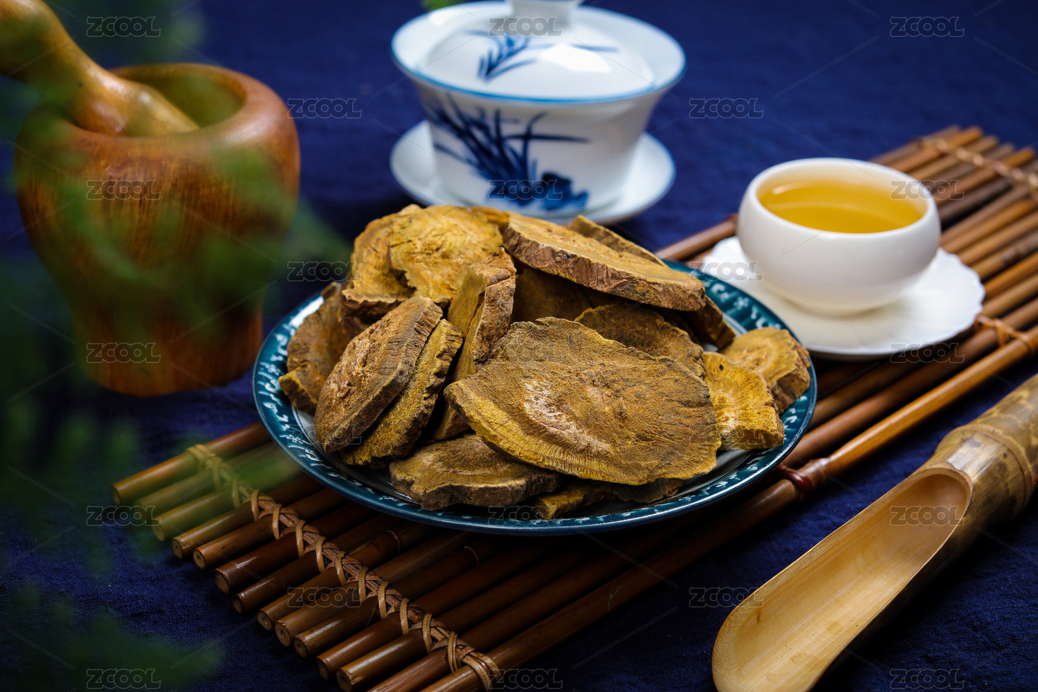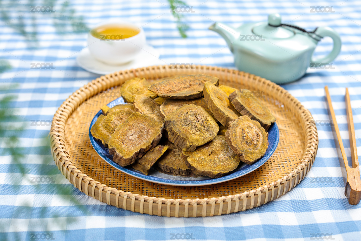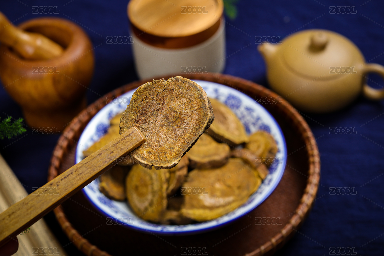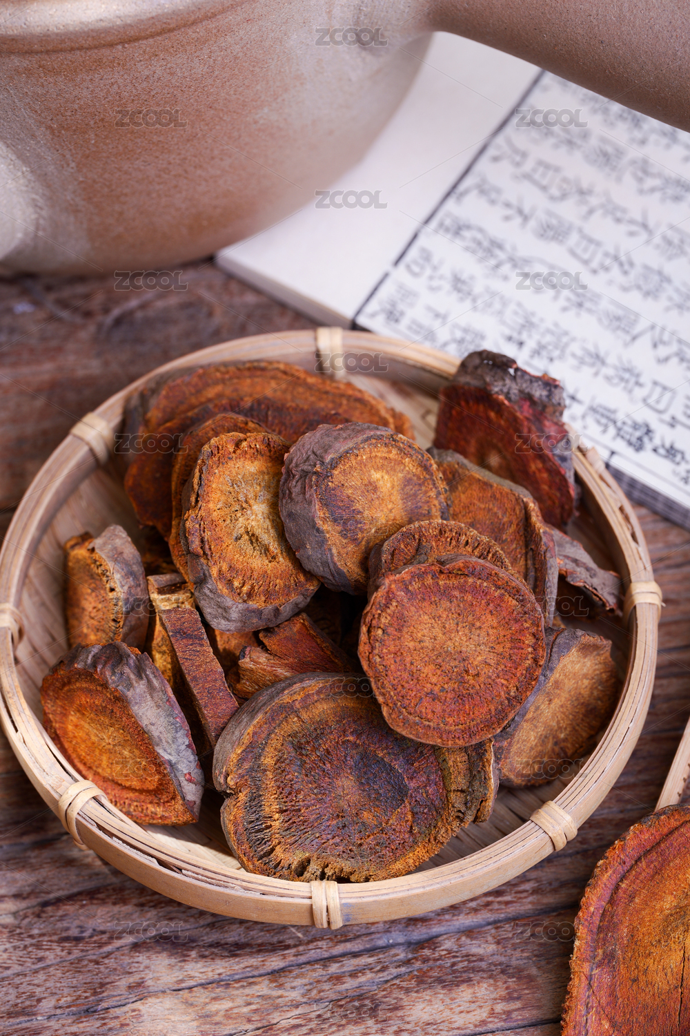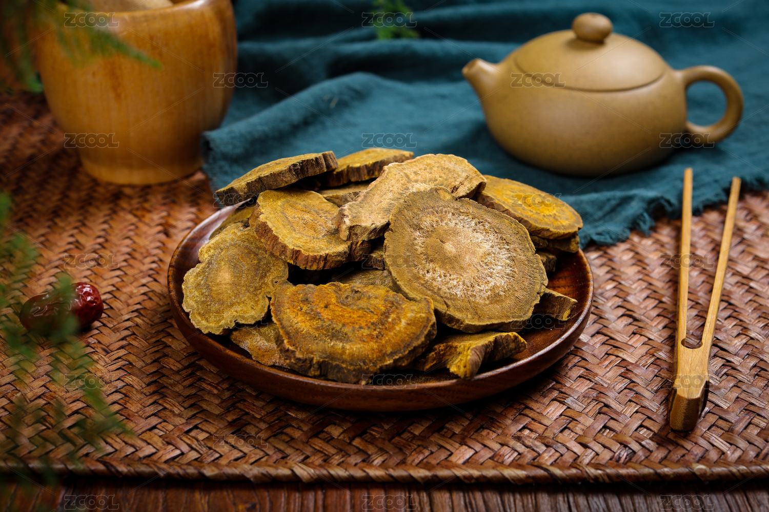 中药大黄在木质盘子里