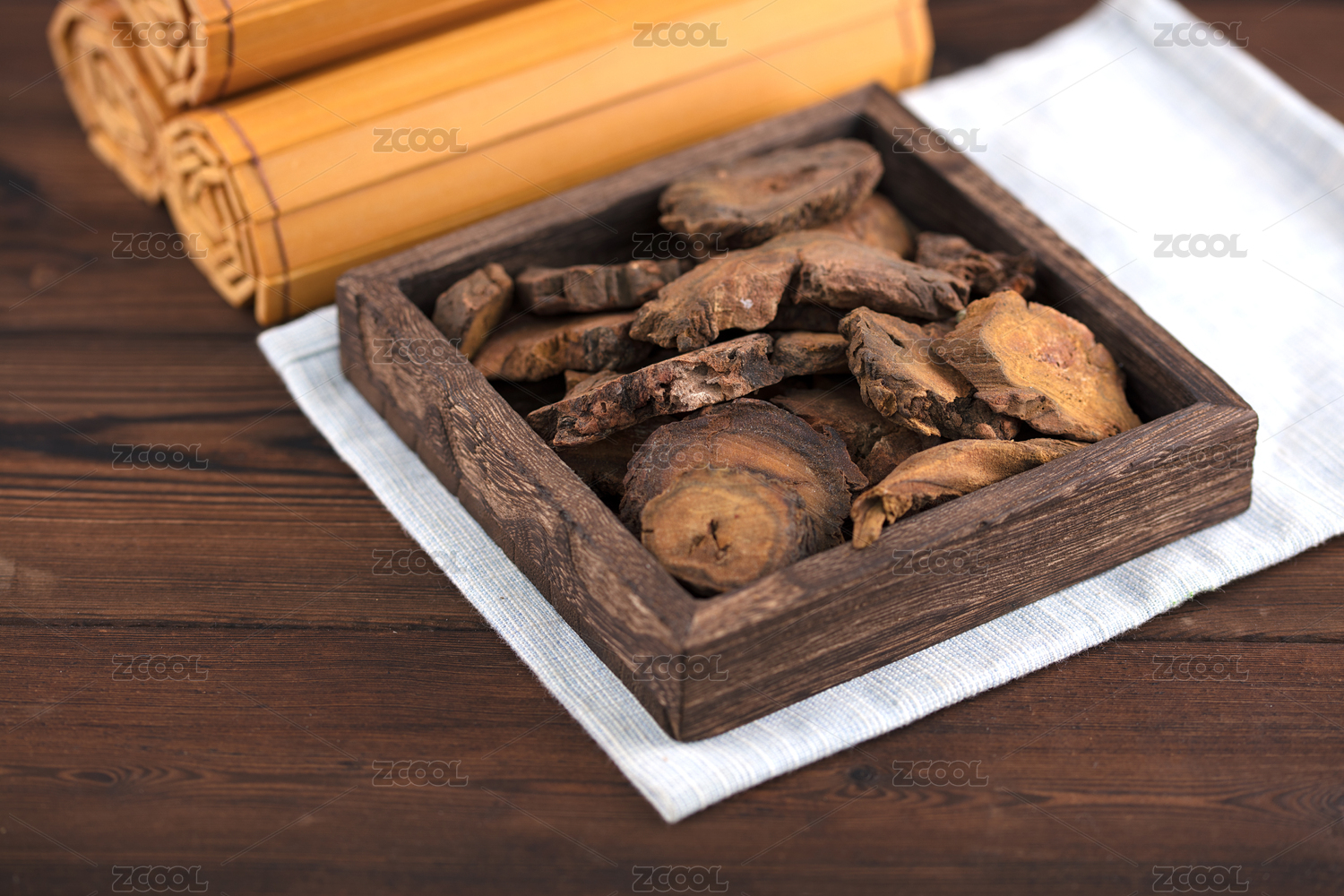 特写中药大黄在木盒里