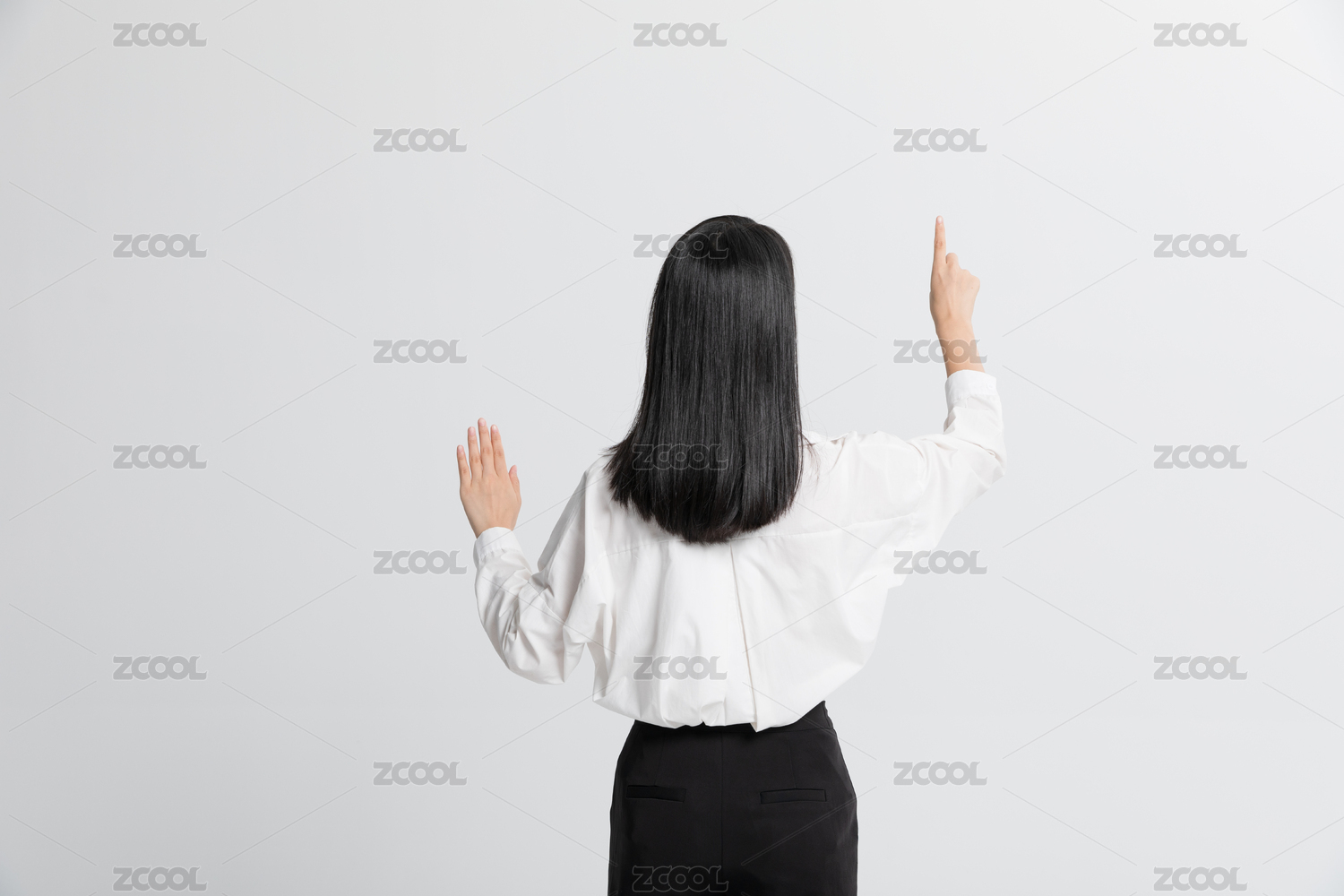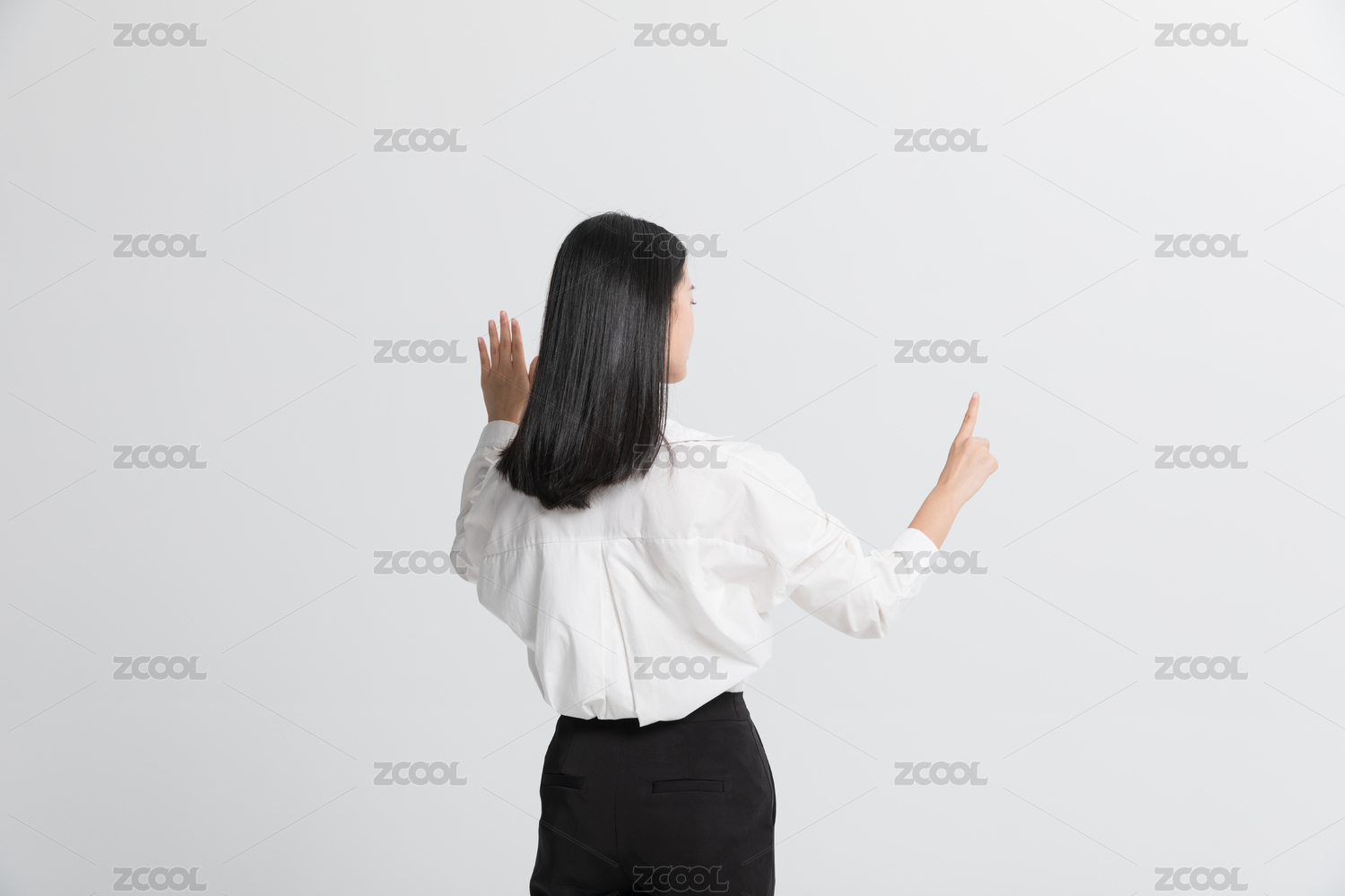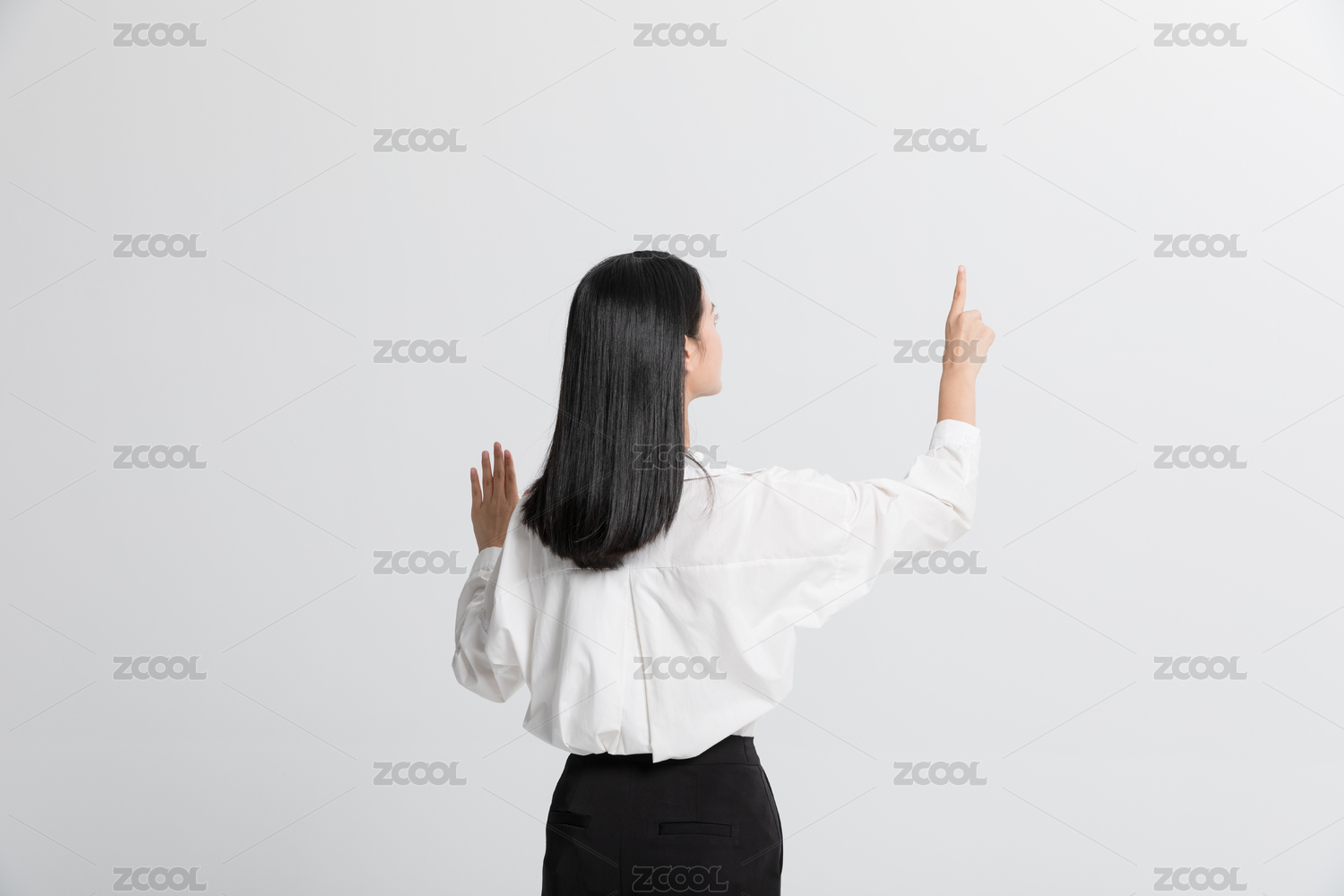 一个穿着西服正装的中国商务女士站在纯色背景下手指触碰着金融线条与美元符号