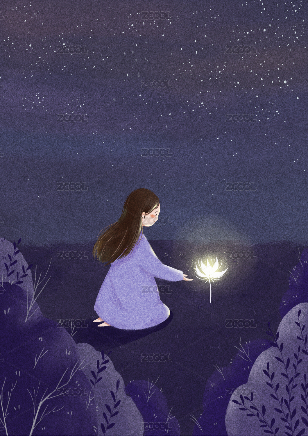 黑暗中少女闭着眼睛伸手触碰发光的蝴蝶插画
