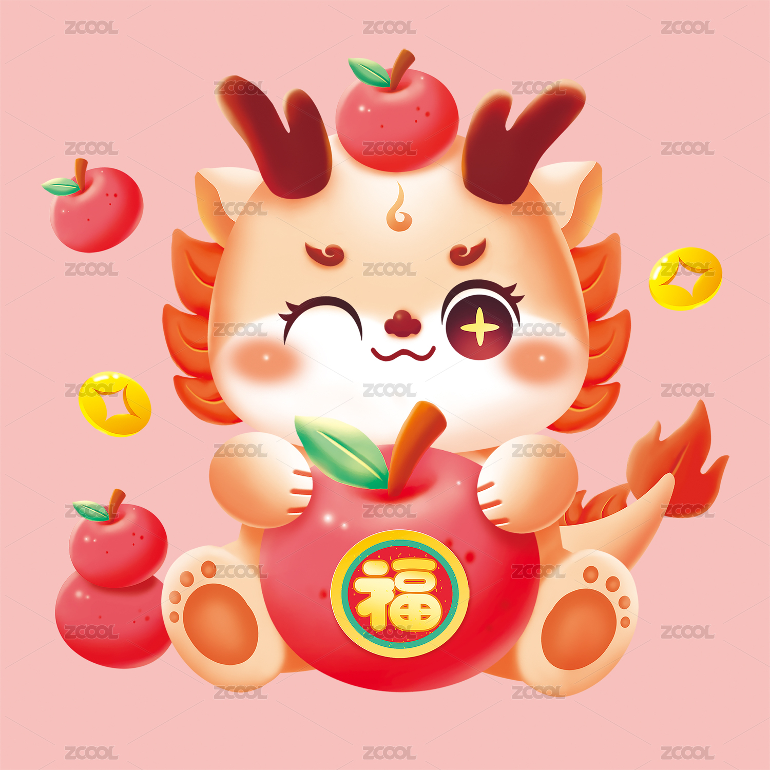 平安喜乐龙年插画苹果福金币