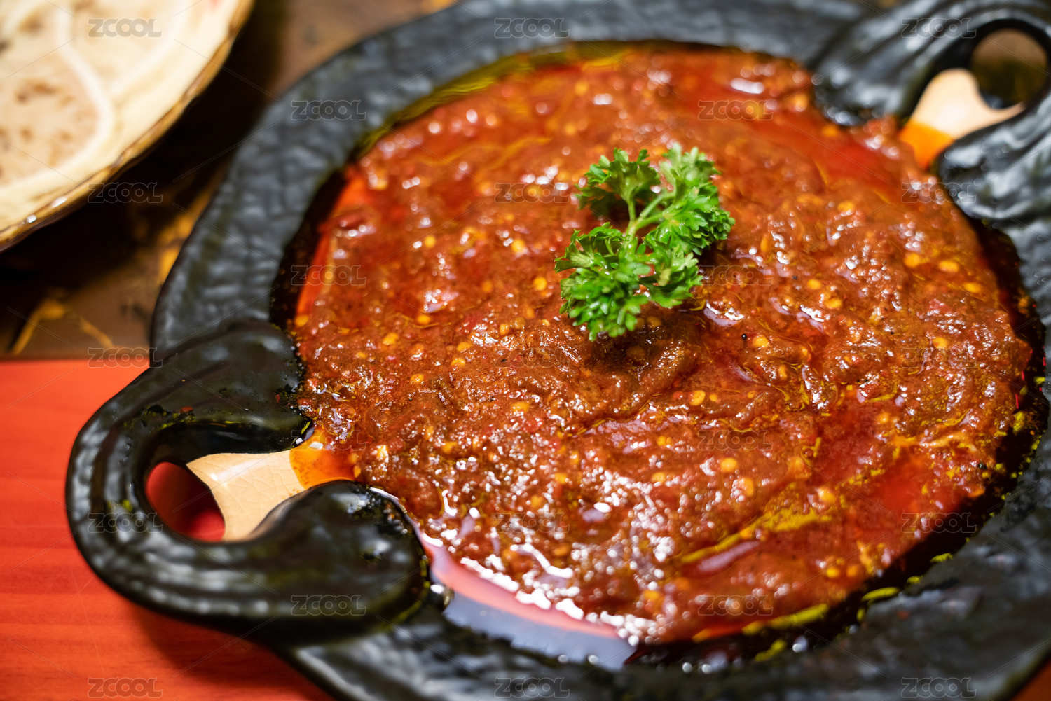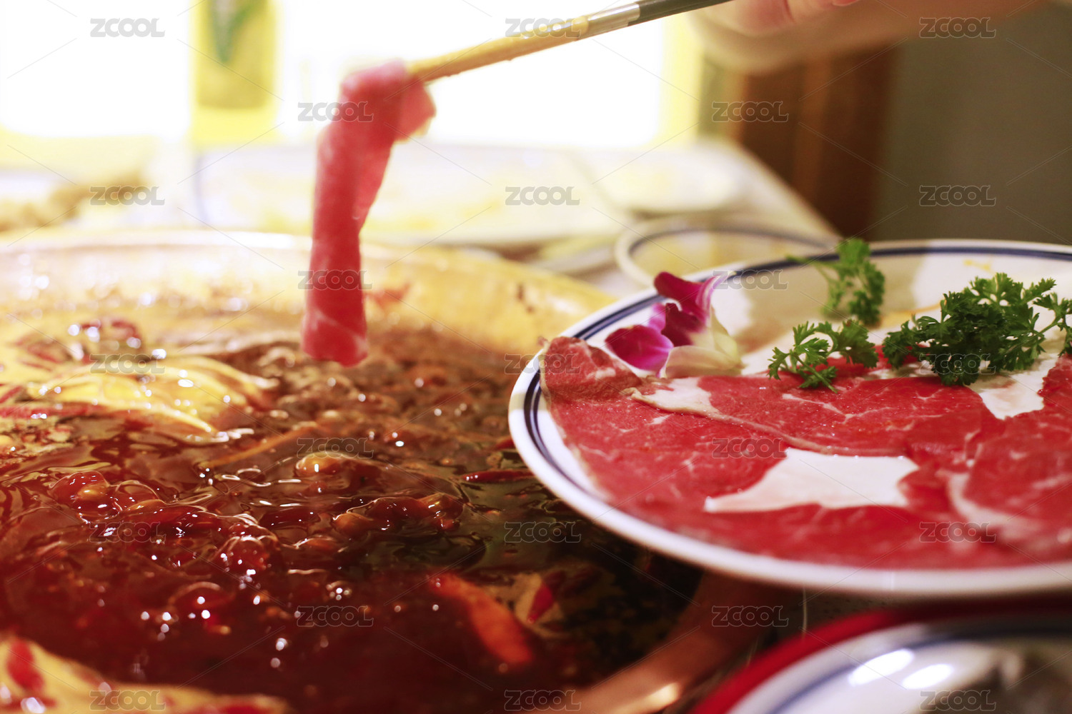 一盘四川火锅菜品麻辣牛肉摆盘放桌子上