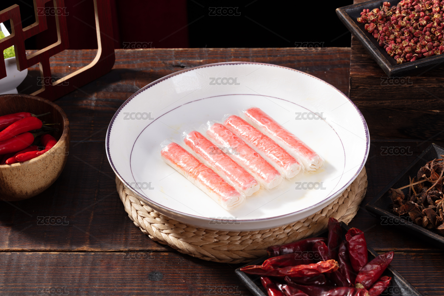 老桌子白盘里的四川重庆火锅菜品蟹棒