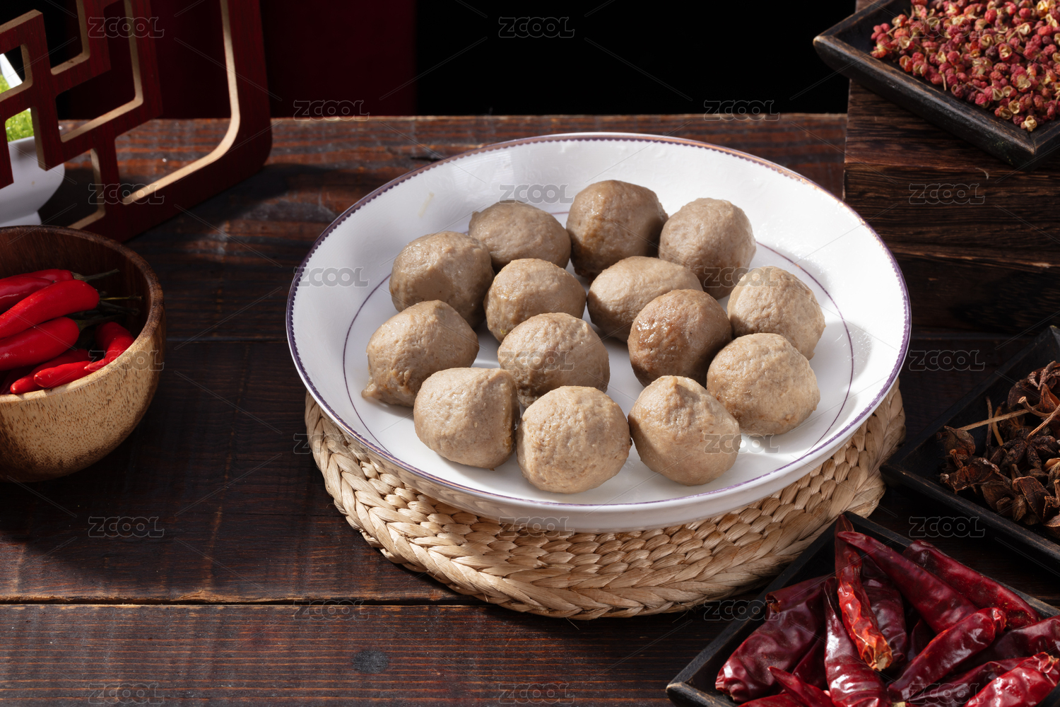 老桌子白盘里的四川重庆火锅菜品牛肉丸子