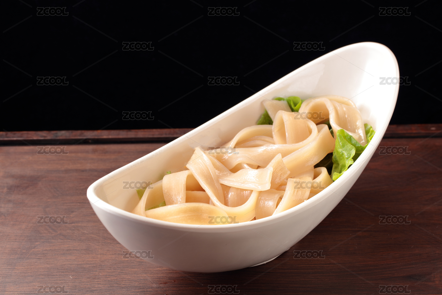 木桌上白盘里的重庆火锅菜品宽土豆粉