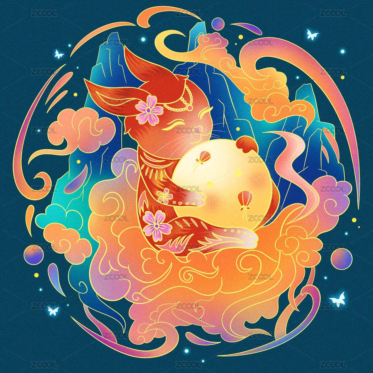 八月十五中秋节满月矢量插画,兔子和祥云符号,山水矢量插画