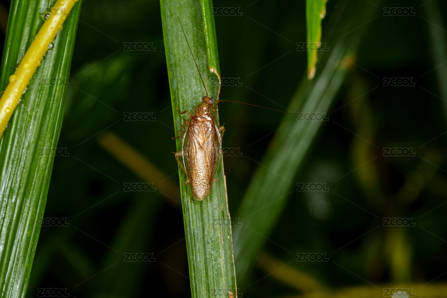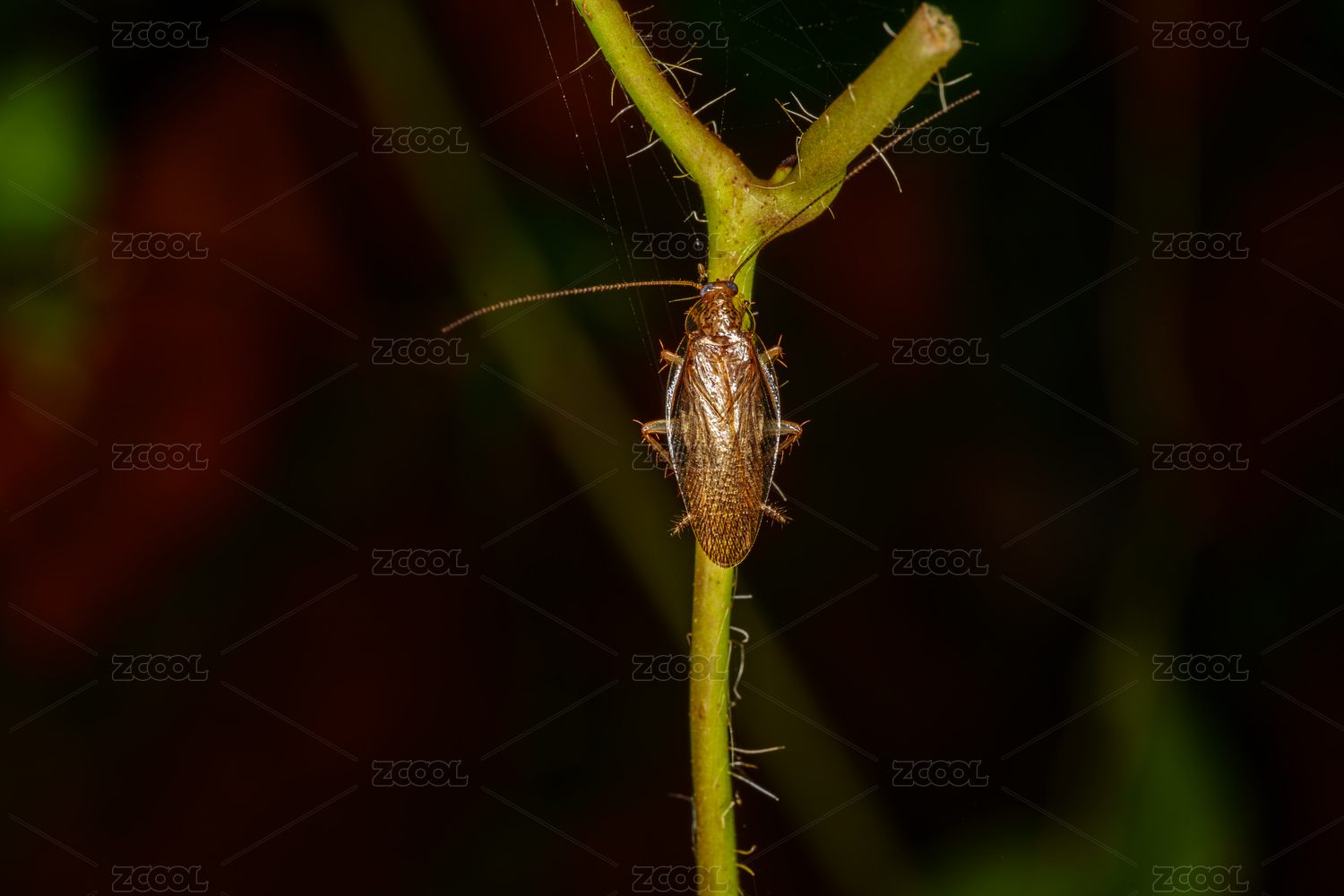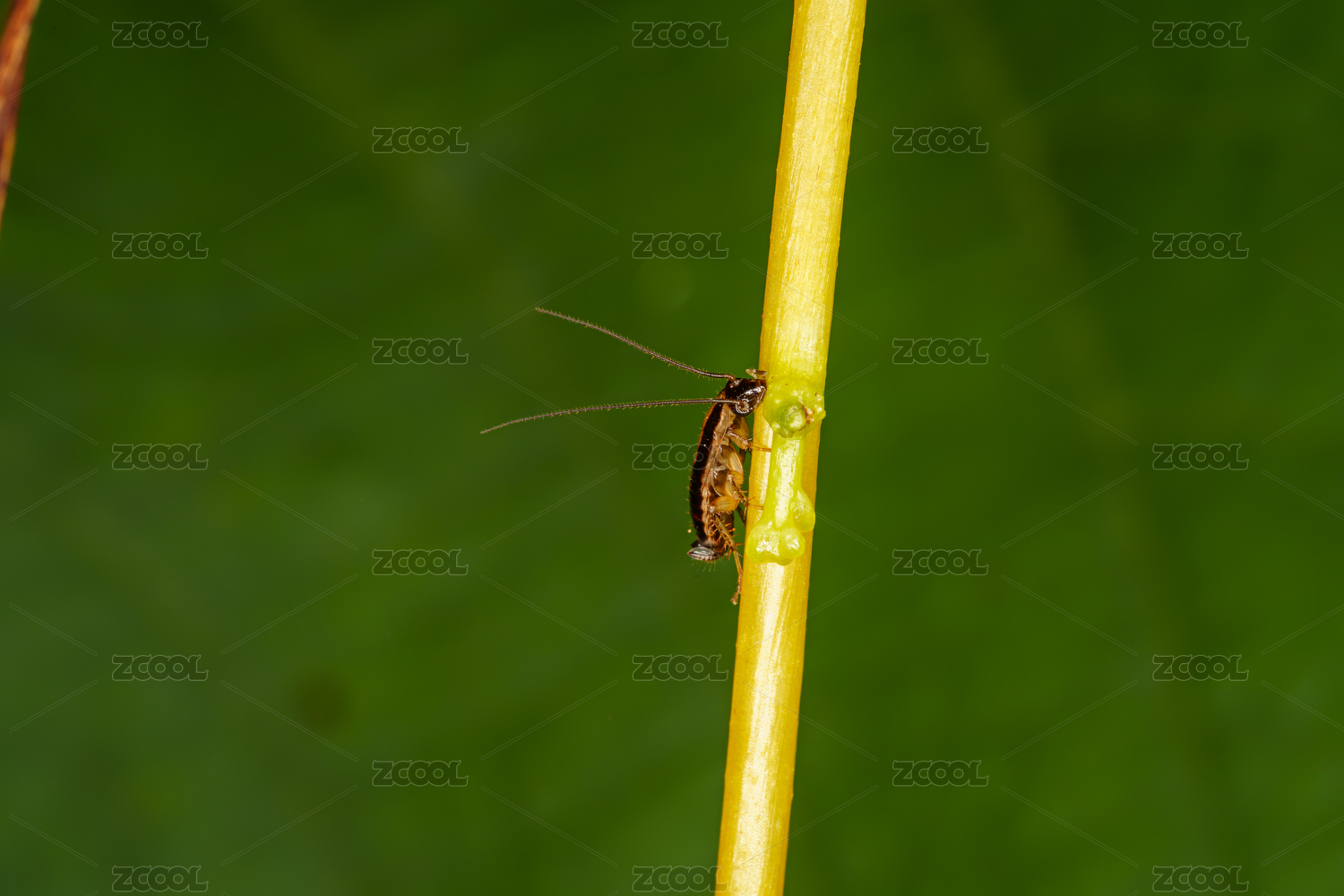 绿色茎秆上的小蟑螂
