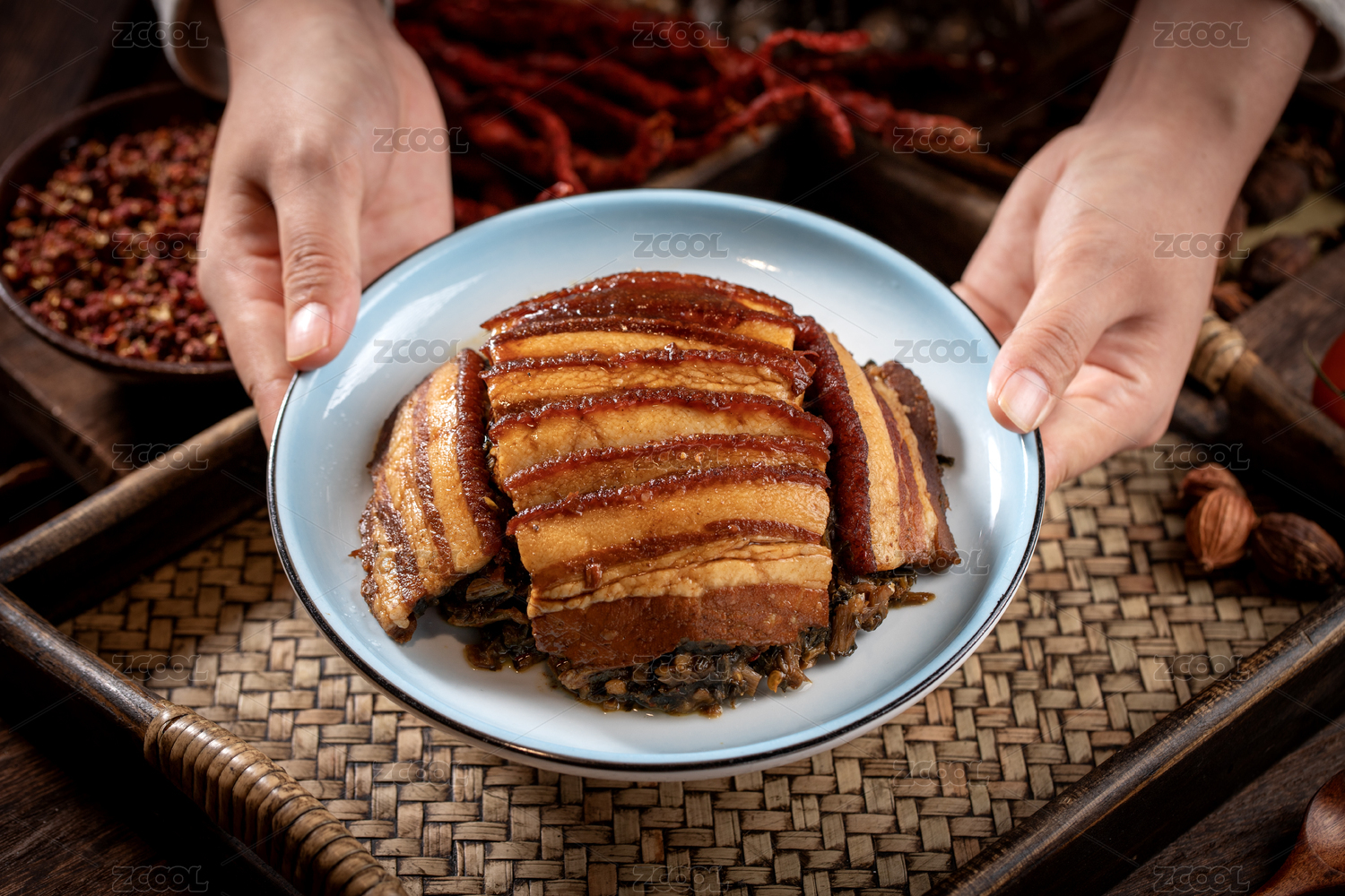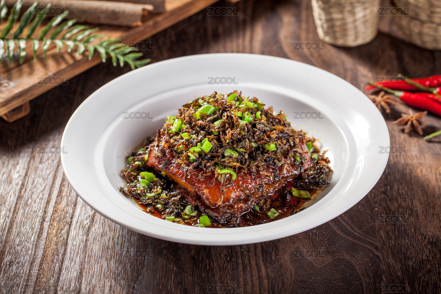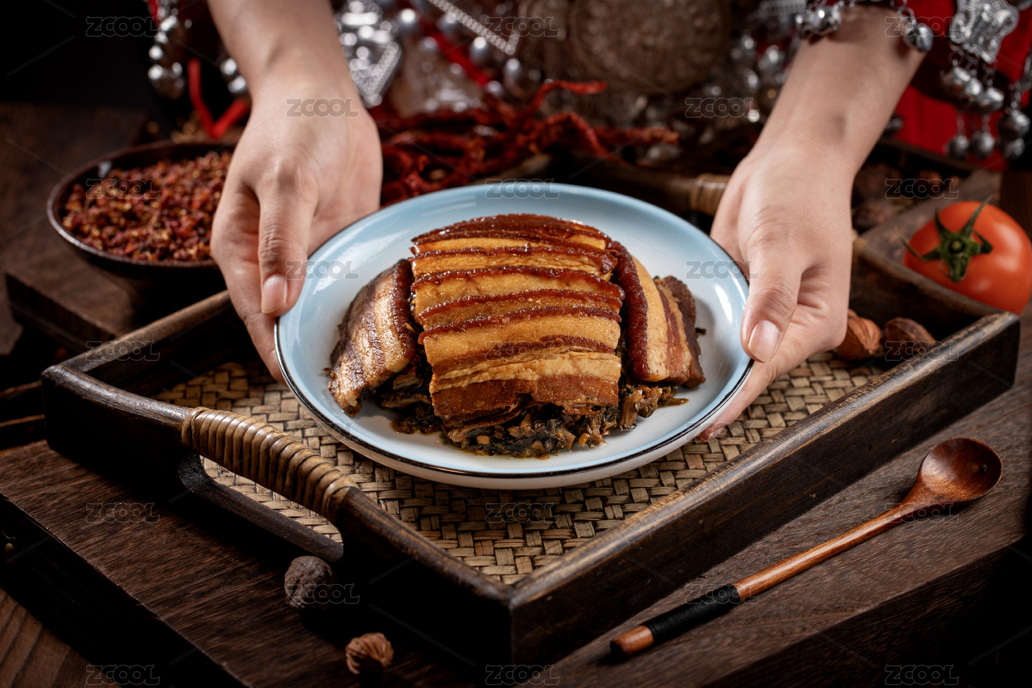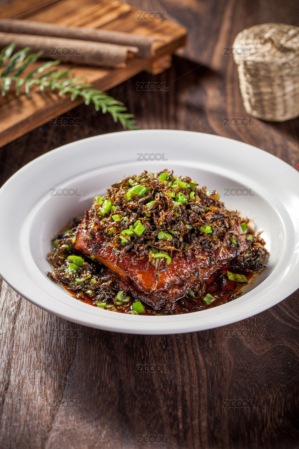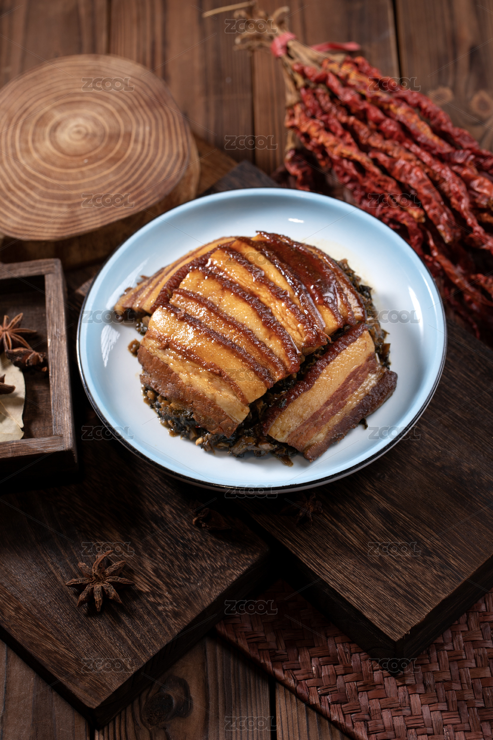 放在蒸笼里的蒸盐菜咸烧白梅菜扣肉