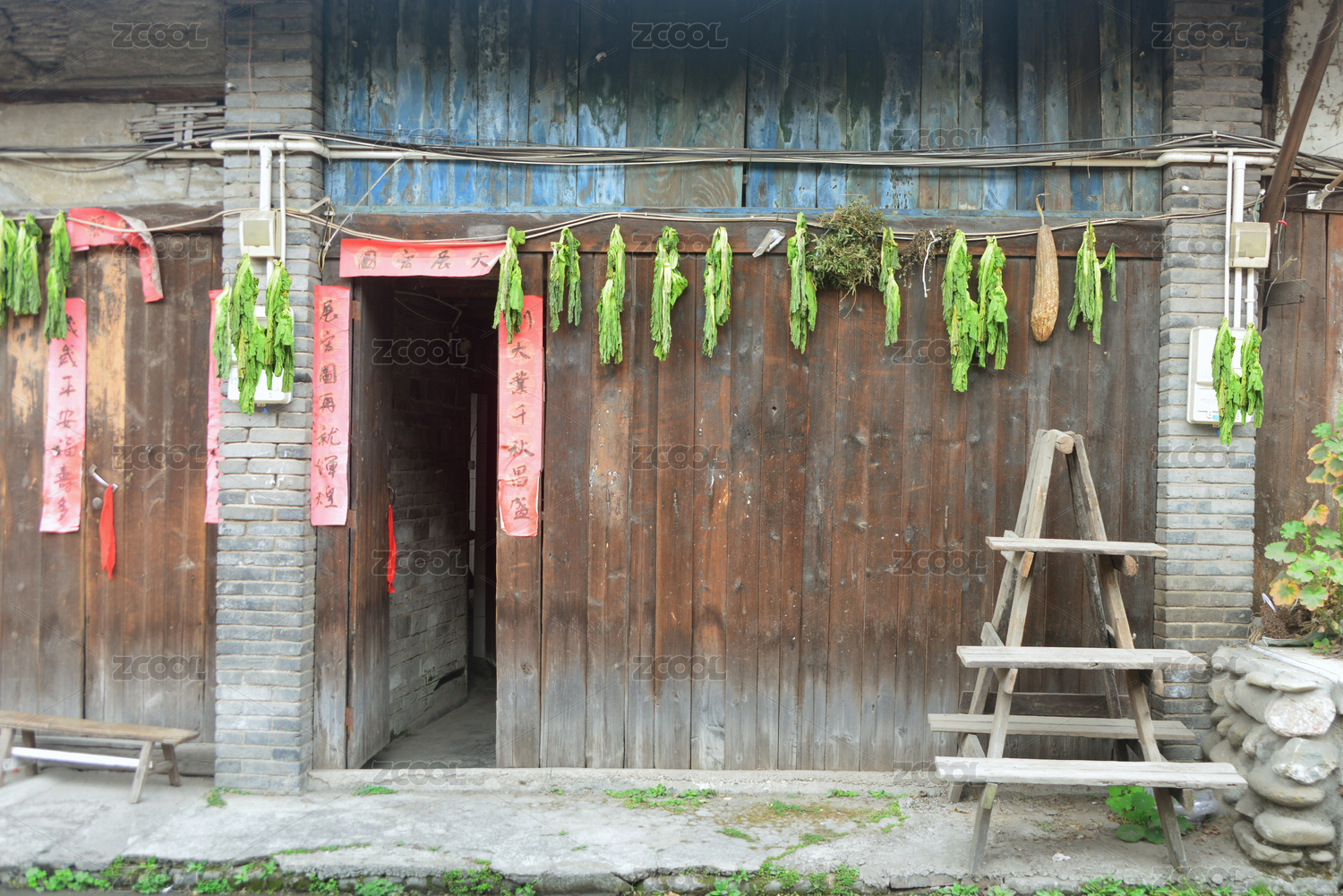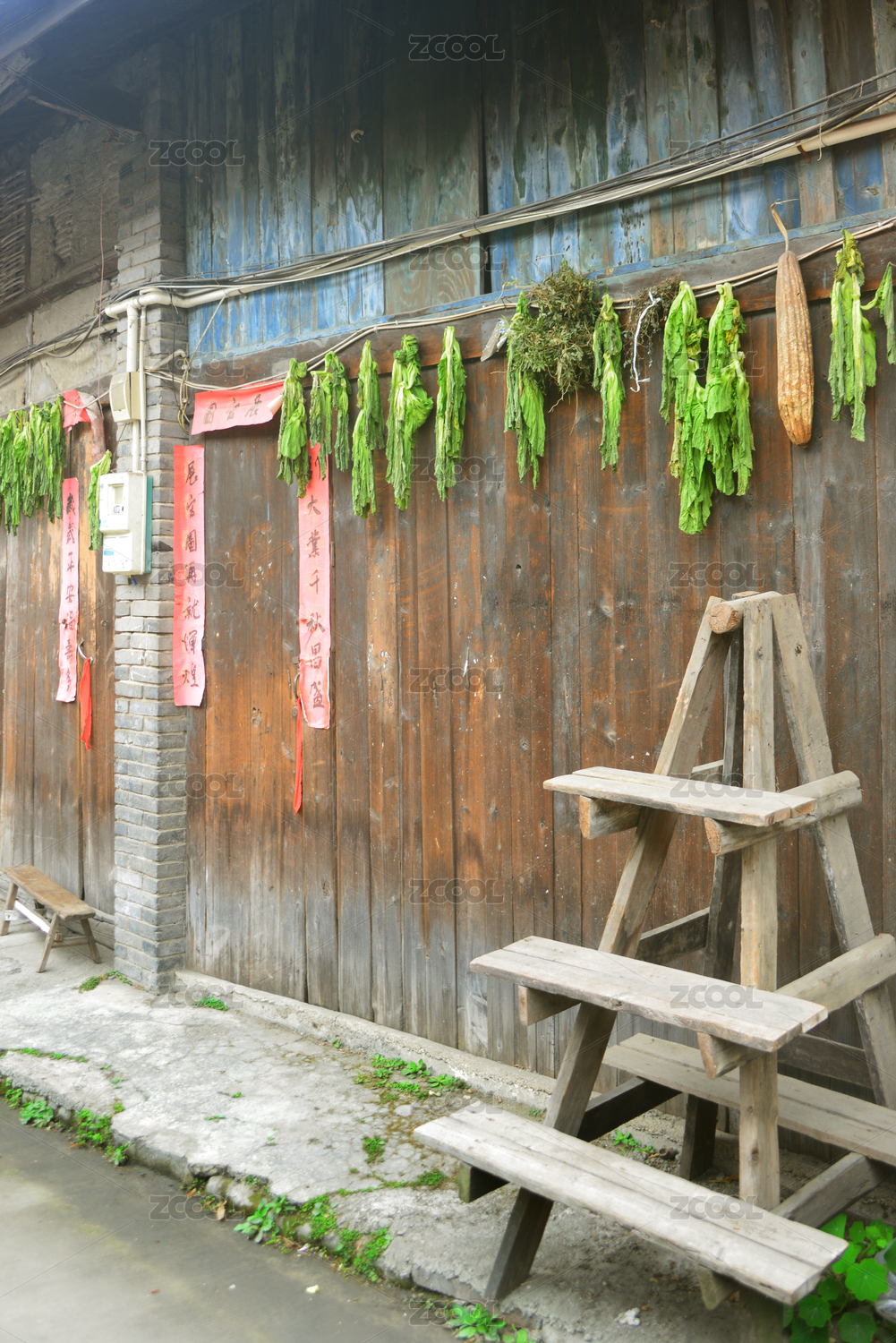 四川成都悦来古镇民居木板墙上晾晒的盐菜