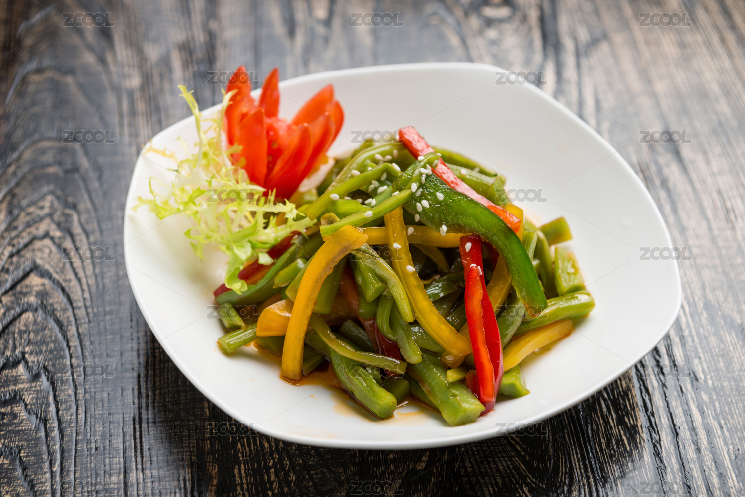 黑底上放着一盘盐菜和筷子上夹着一块开胃菜