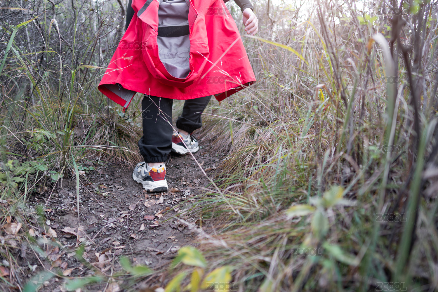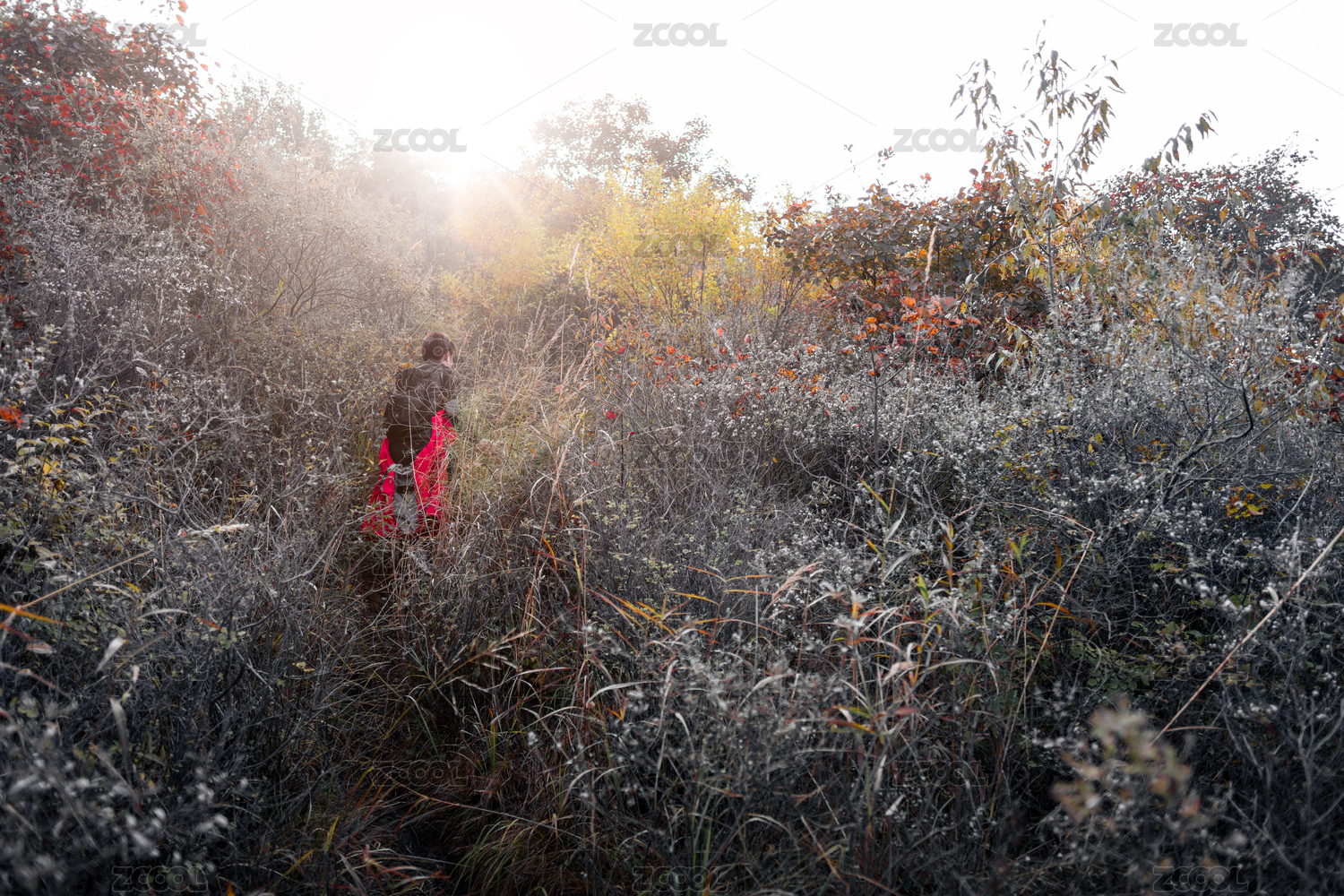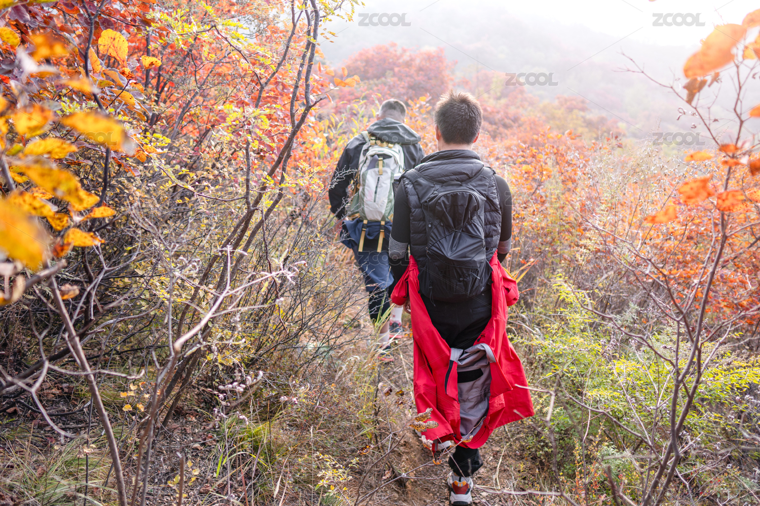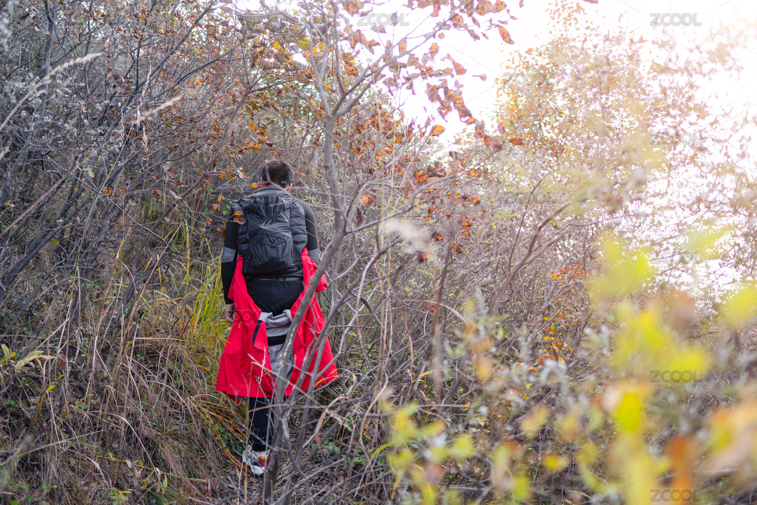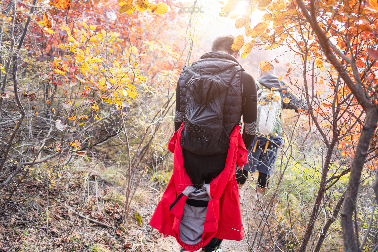 秋季爬山爱好者的背影在山里