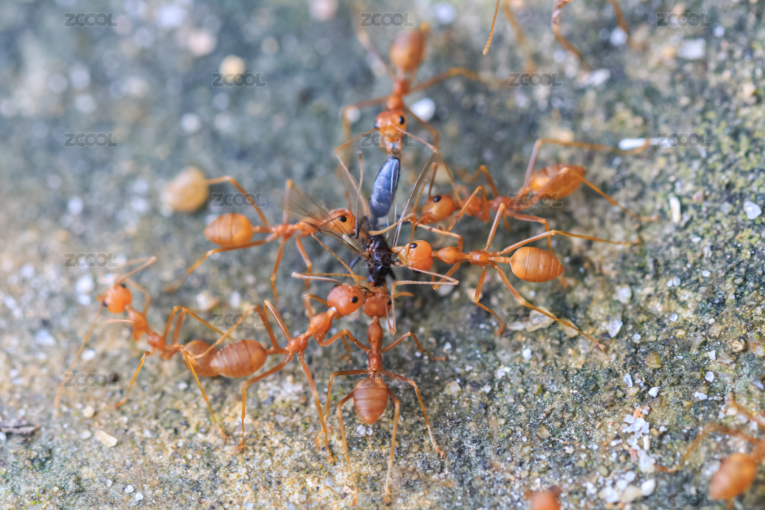 一群蚂蚁正在猎食一只大黑蚂蚁